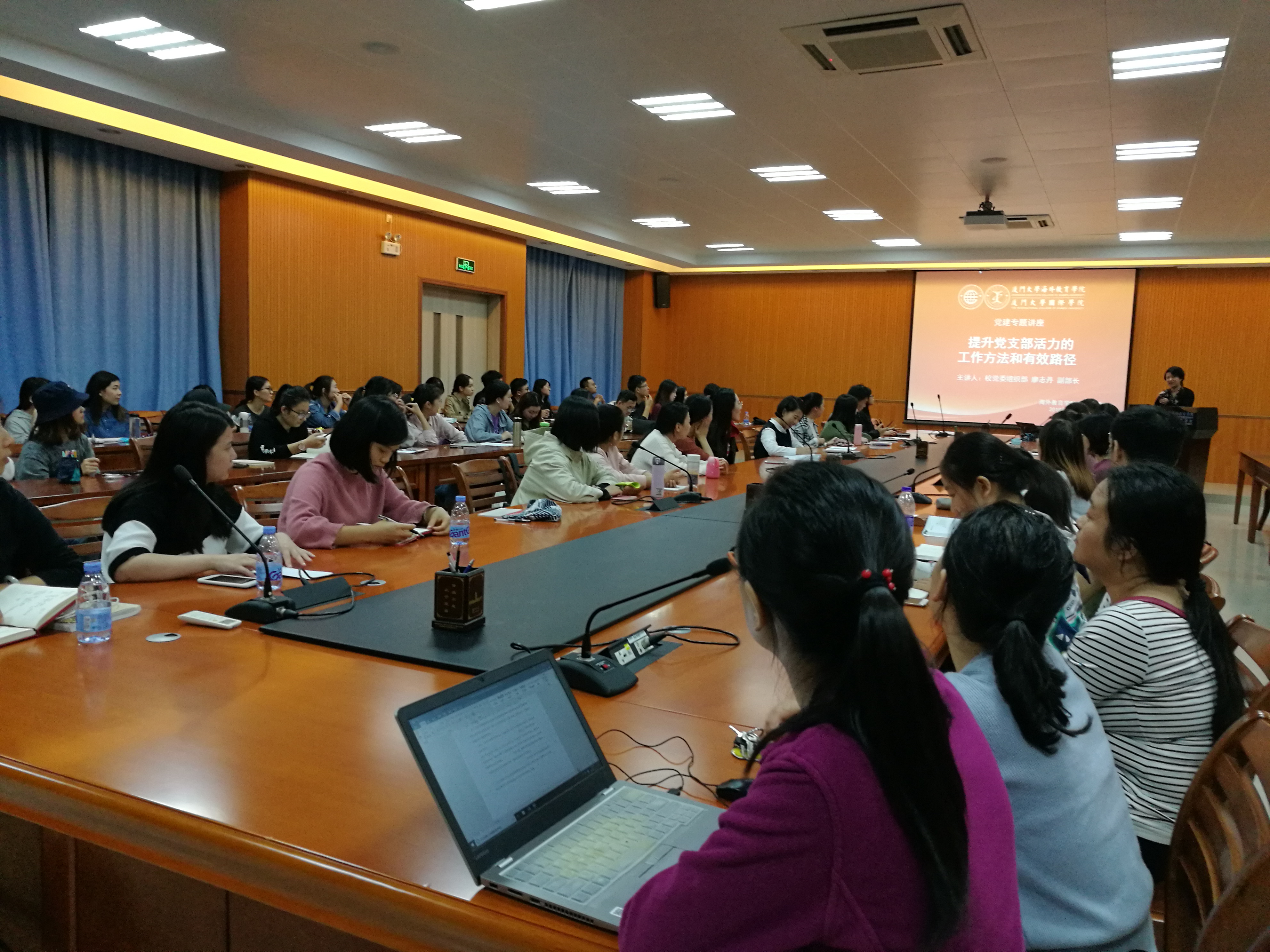 廖部长还结合自己党建工作经历和一些党支部工作立项活动案例,详细讲解了支部立项的要求和“窍门”。她讲到,支部立项是加强基层党组织建设的重要平台,一个好的支部立项它的设计立意要高,运作过程要实,活动参与要广,成果实效要显著。她向在场党员展示了兄弟学院“景润小学”学生党支部立项和“健康社区行”教师党支部立项的申报与建设情况,根据两学院学生和教职工的相对优势分析了支部立项应展现的闪光点和创新点。