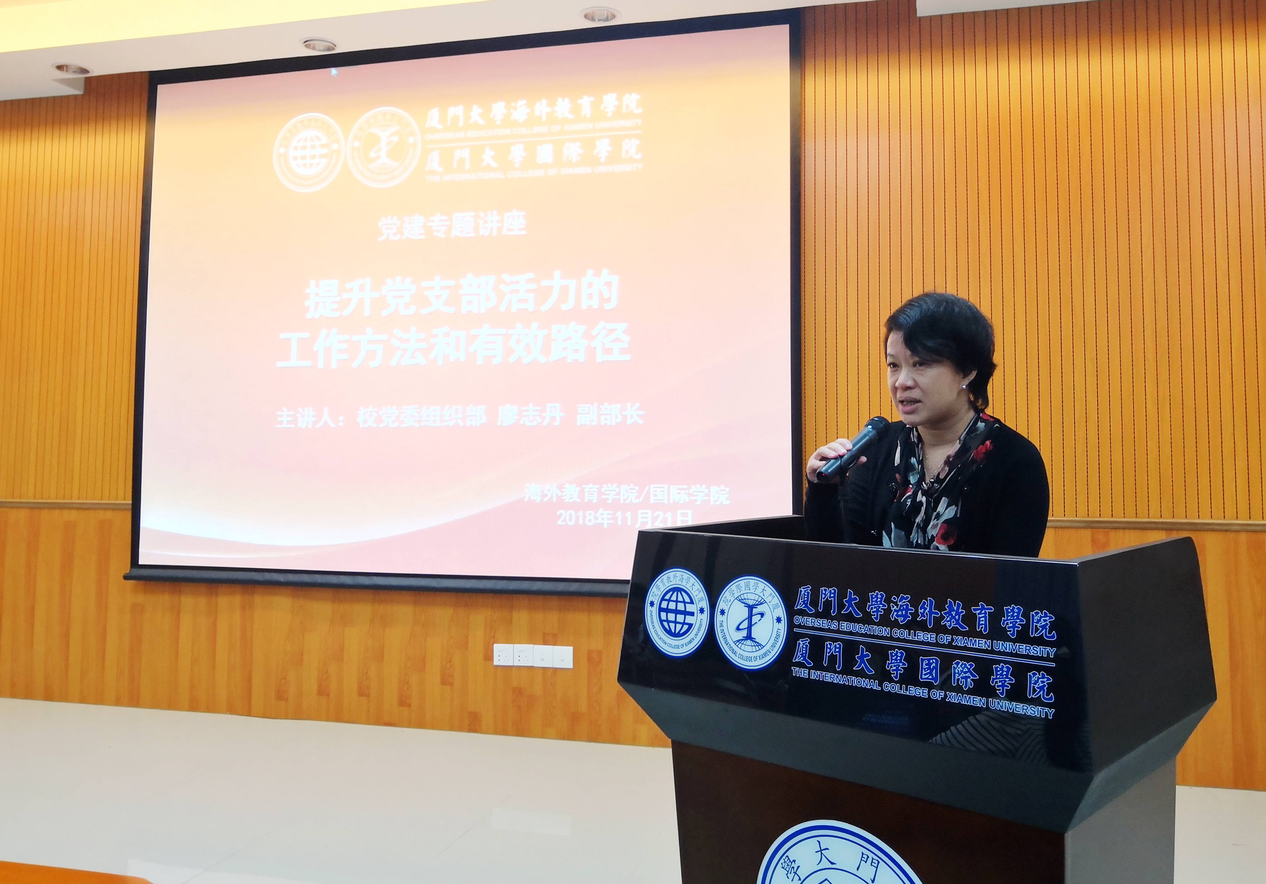 11月21日晚7时,校党委组织部副部长廖志丹老师应邀来到海外教育学院/国际学院C104会议室,在学院党委二级党校作了题为《提升党支部活力的工作方法和有效路径》的党建专题讲座。讲座由学院党委书记王艺主持,学院教工党支部委员和全体学生党员出席了讲座。