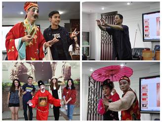 此外,演员们还邀请在座学生上台学习经典舞台动作。在互动表演中,埃塞俄比亚留学生勇于上台挑战丑角装扮,有模有样地晃手臂、摆身段,将丑角的精髓表演得别具风味;国内汉硕女生们以娉婷之姿将“开门”这一花旦动作表演得淋漓尽致,全场掌声连连;孟加拉国留学生徐谦则一副花脸装扮,反行当挑战“布袋戏”丑角,现场观众们笑声不断。