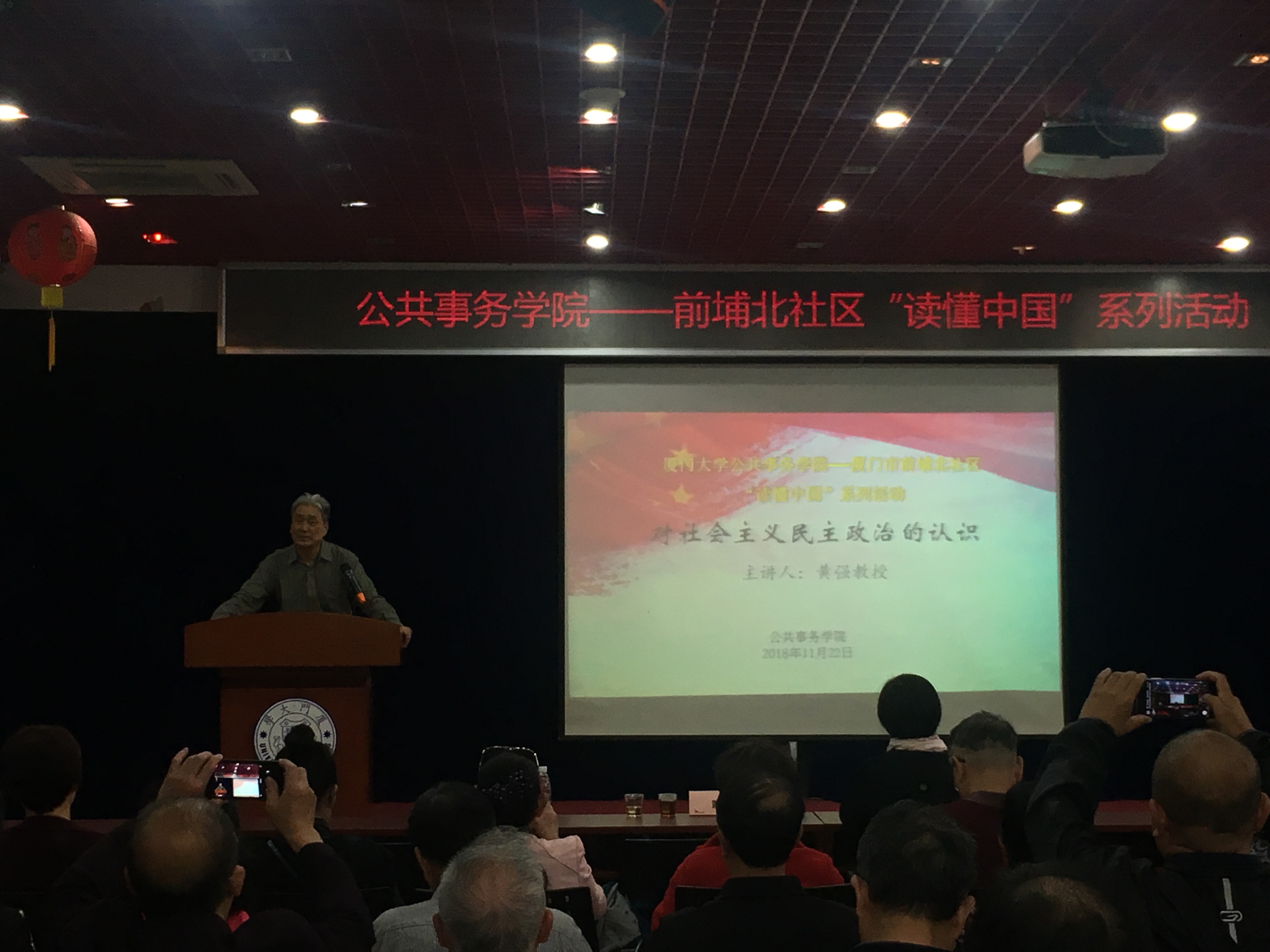现场体验式学习结束后,在公共事务学院党委副书记刘钟南老师主持下,学院青年学生党员和社区党员们共同聆听了学院退休老教授、厦门大学原政治学与行政学系主任黄强老师的专题讲座。黄强教授长期从事哲学、政治学、行政管理学、领导科学等教学科研工作,是政治理论研究方面的专家。他以《对社会主义民主政治发展的认识》为题,用系统精炼的语言和生动的事例,深入浅出、生动形象地讲述了“为什么要旗帜鲜明讲政治?”“为什么要净化政治生态?”“为什么要充分发扬社会主义民主政治?”等问题,帮助大家加深了对中国特色社会主义民主政治的全面认识,引导大家进一步坚定理想信念,不忘初心跟党走。