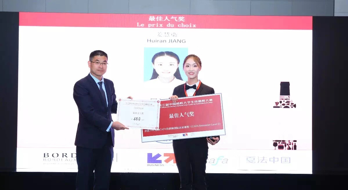 近日,第三届“中国高校大学生侍酒师大赛”决赛在北京落下了帷幕。通过激烈的角逐,来自我校国际学院的姜慧染同学不负众望,凭借其出色的表现获得了“最佳人气奖”。