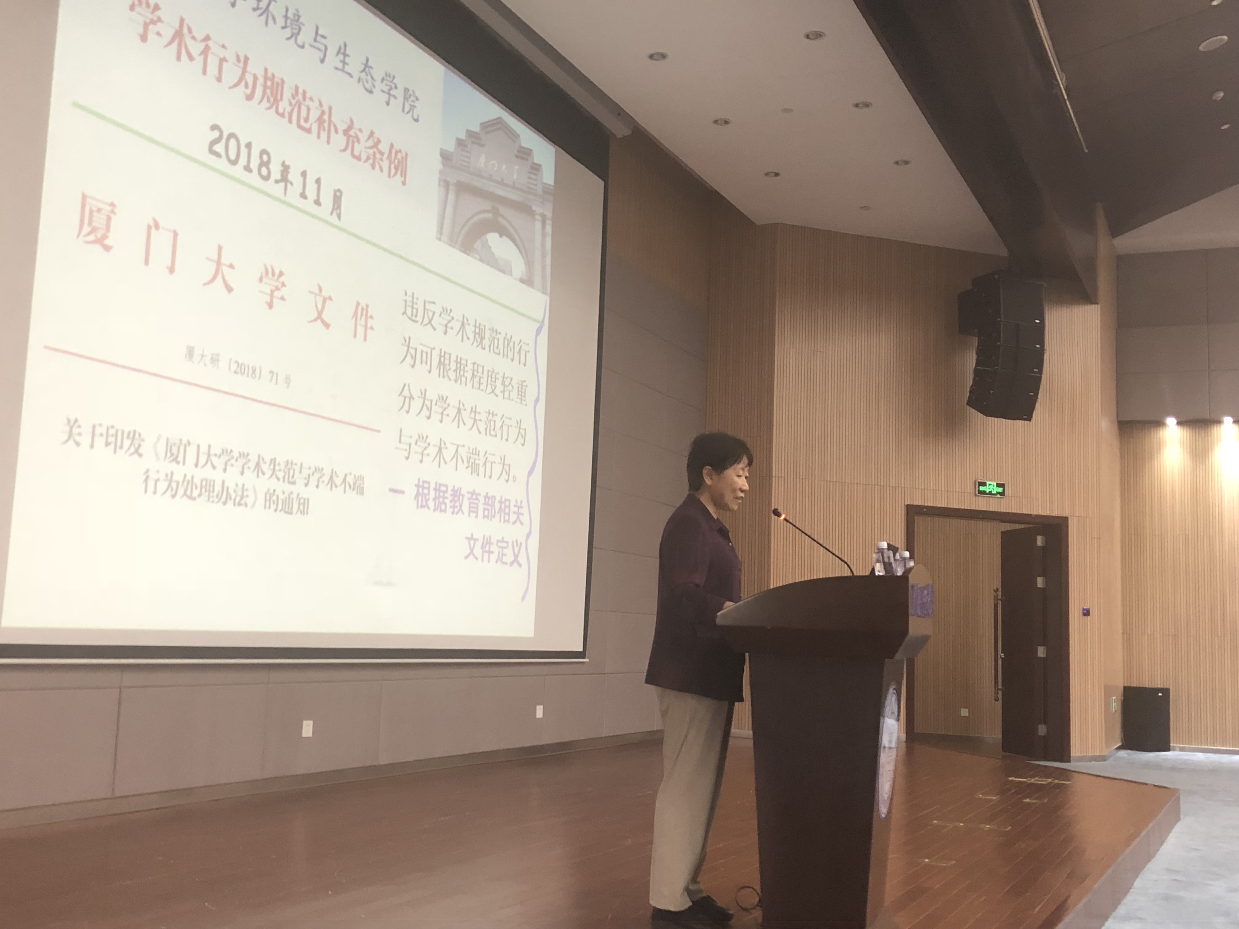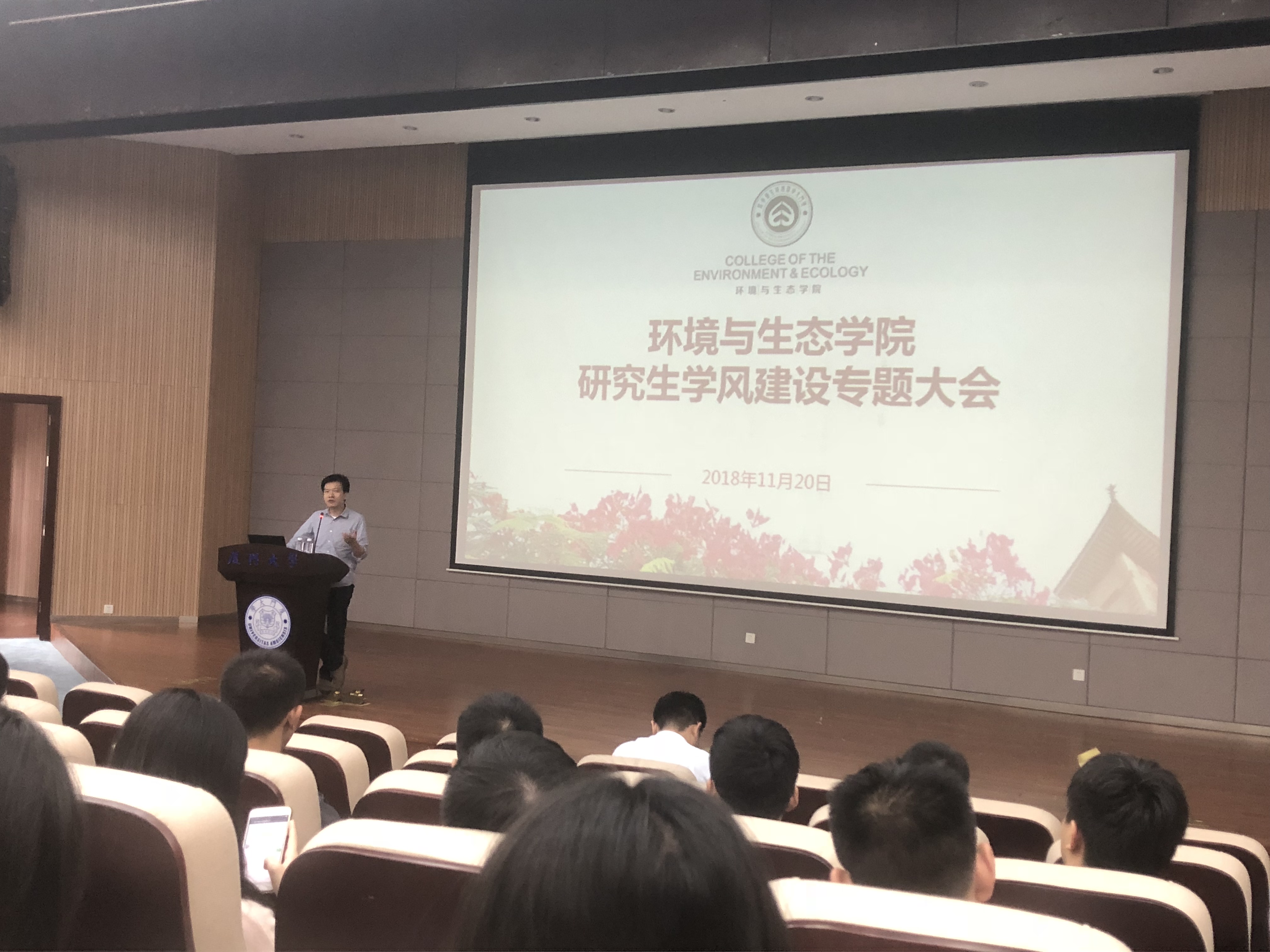 为贯彻落实全国教育大会精神、2018年全国科学道德和学风建设宣讲教育报告会的精神和厦门大学关于学风建设及学术道德规范的要求,2018年 11月20日中午,环境与生态学院在翔安校区德旺图书馆二号报告厅召开了“环境与生态学院研究生学风建设专题大会”。大会由校研究生院教育指导小组成员袁东星教授和副院长史大林教授主讲,院党委副书记周克夫、院团委书记林明华、研究生秘书何鸿鸣、辅导员蔡群飞及全院硕博士研究生参加了本次会议。