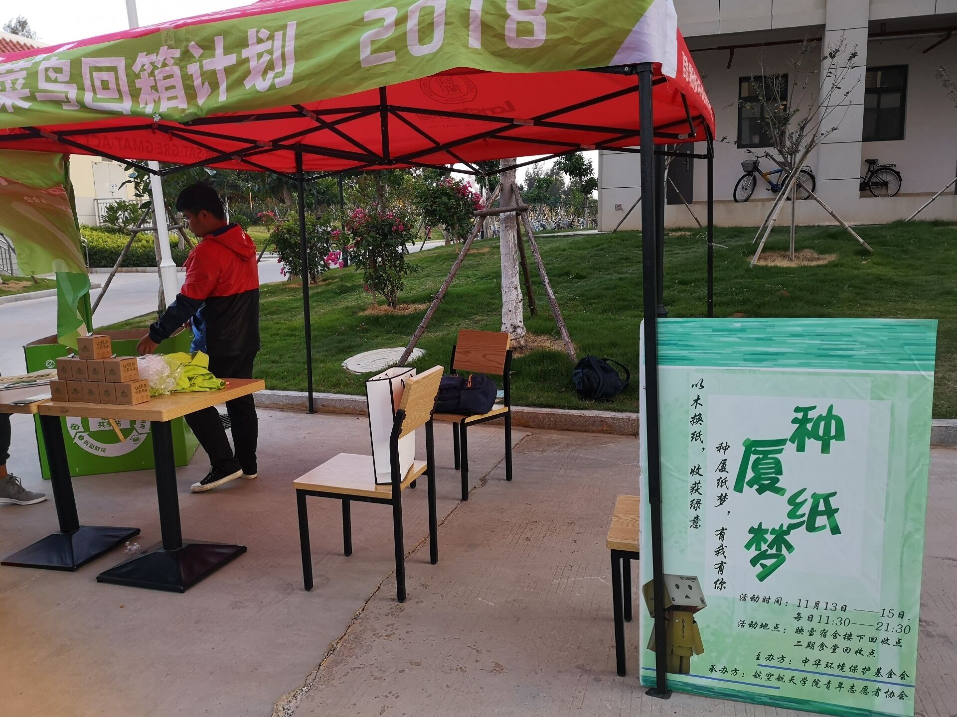 2018年11月13日-15日,由中华环境基金会主办,厦门大学环保协会、凤凰花社、爱心社、航空航天学院、能源学院、海洋与地球学院三院青年志愿者协会共六个单位承办的“双十一菜鸟回箱计划”在厦门大学翔安校区有序开展。此活动与航空航天学院长期进行的“种厦纸梦”活动主题不谋而合, 所以我院青协将“种厦纸梦”活动也融入了本次的菜鸟回箱计划,为本次活动助力。