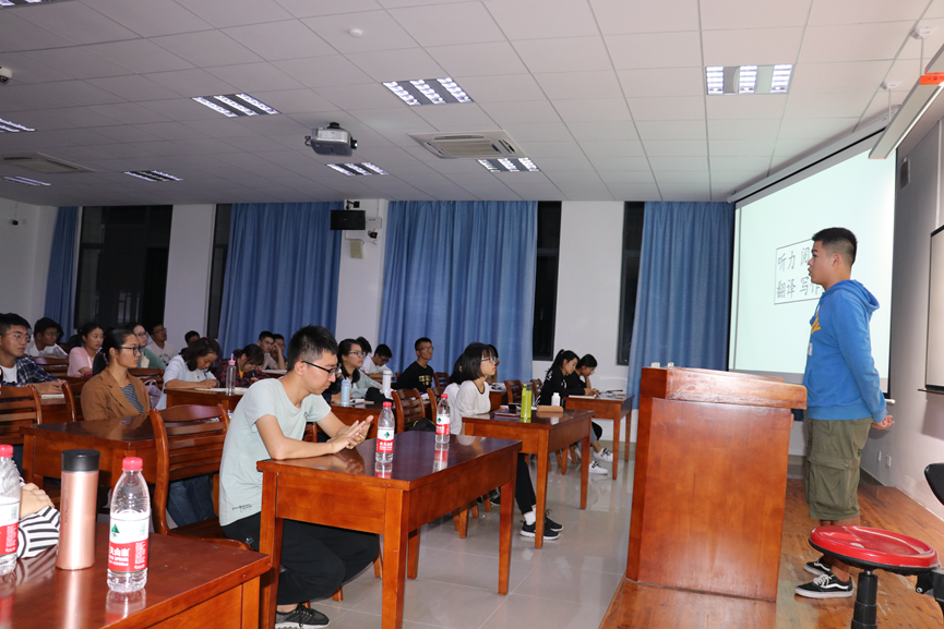 10月23日晚7点30分,在学武楼的B213室正式举办了四六级高分英语交流会。此次交流会由就业拓展中心的阙梦茹主持,并邀请了两位2016级本科四六级高分学生梁成和徐天宇作为演讲嘉宾。