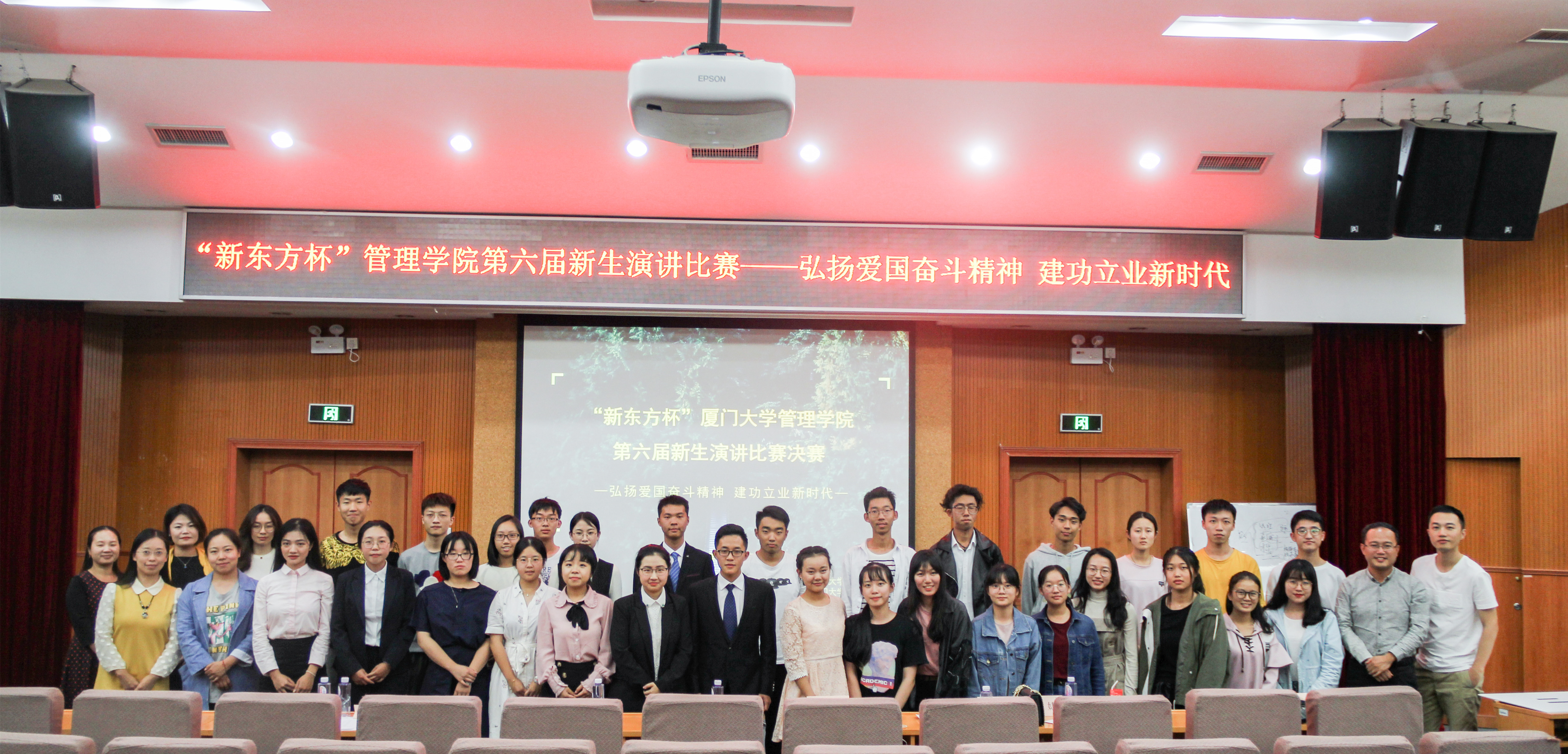 2018年10月28日晚,厦门大学管理学院“新东方杯”第六届新生演讲比赛决赛在化学报告厅顺利举行。管理学院本科新生300余人共同观摩、学习了比赛。大赛由厦门大学管理学院主办,管理学院学生会承办,厦门新东方学校协办。大赛特邀厦门新东方学校特邀嘉宾吕瑞文、管理学院党委副书记戴蓥、团委书记江娇、团委副书记吴荣梅、吴光锡、建筑与土木工程学院辅导员林婕、生命科学学院辅导员吴佳蓓担任评委。