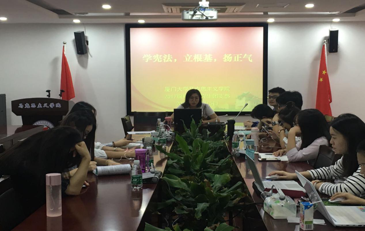 2018年10月15日上午,马院2017级硕士研究生团支部成员在囊萤楼302教室开展“学宪法,立根基,扬正气”主题团日活动,全体成员参与此次活动。