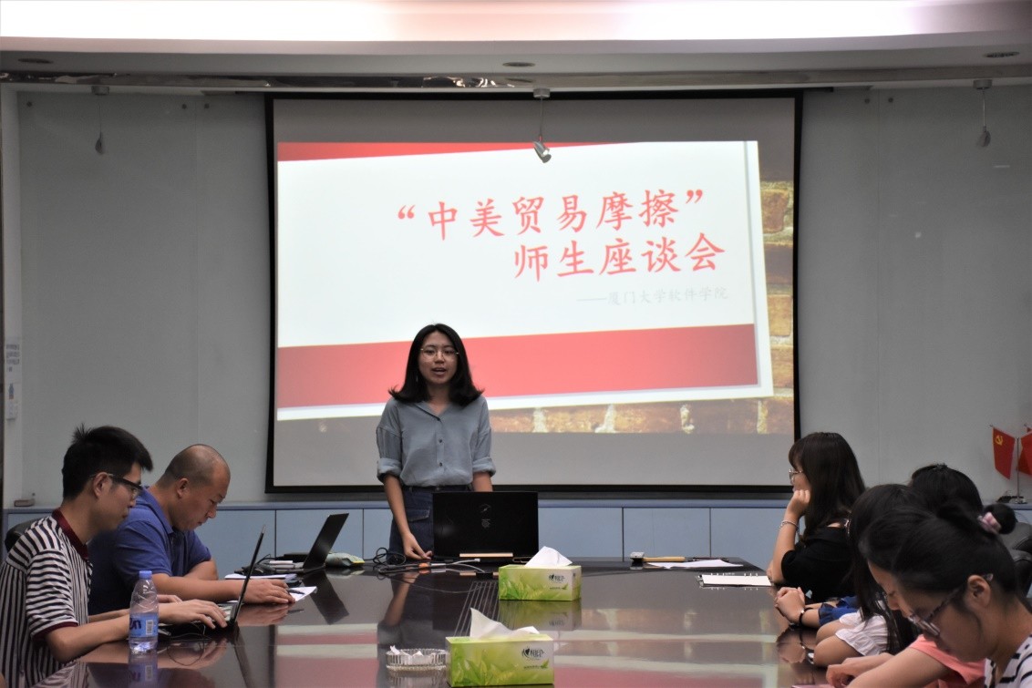 9月29日晚七点半,软件学院“中美贸易摩擦”师生座谈会在海韵行政楼306顺利召开。学院团委副书记李绍玉老师与来自本科生、研究生各年级团支部书记、宣传委员以及学生代表共同参加了座谈。座谈会由学院团总支书记赵雨宣同学主持。