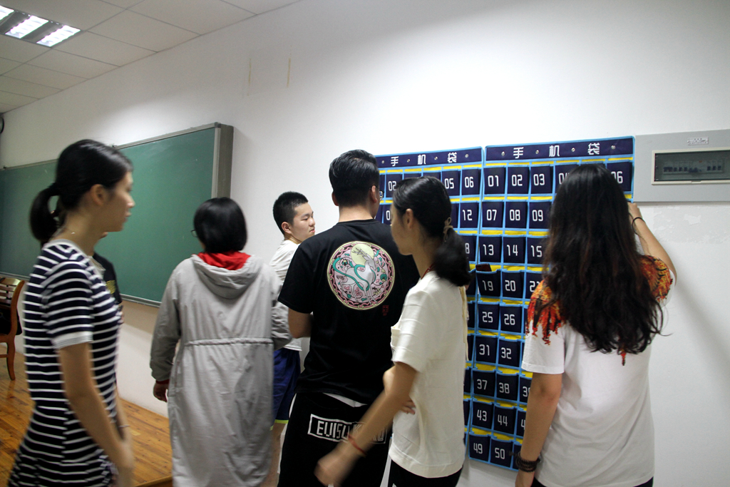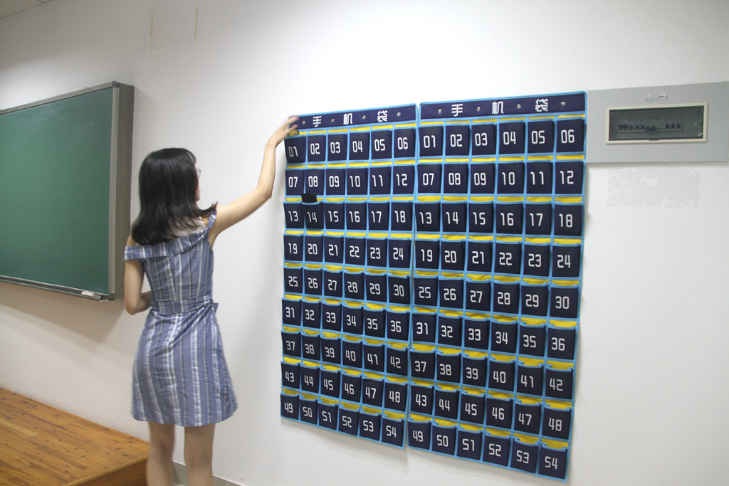 从本学期开始,当国际学院的师生们进入主楼2号楼教室,就会发现教室内多了一件装备——“手机收纳袋”。上课前,老师和同学们自觉将把手机调至关机或静音模式,放进收纳袋的小口袋里,课后再领回手机。