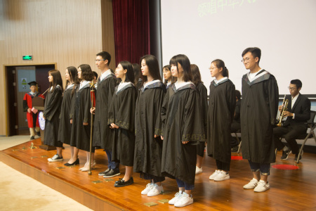 在厦门大学翔安校区学生交响乐团的指挥下,我院优秀毕业生代表上台领唱国歌,报告厅中回荡着庄严的国歌声。