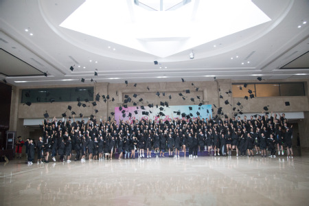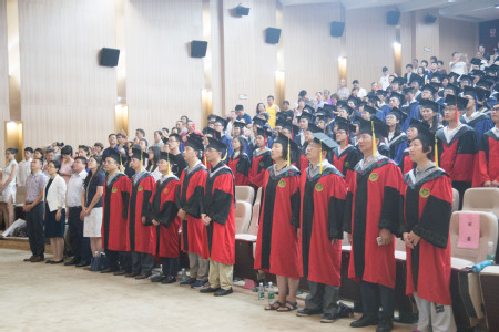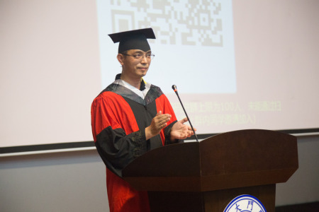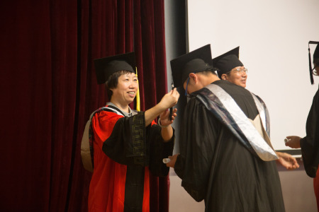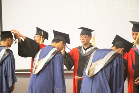 在激昂的歌声中,毕业生们依次上台,学院领导、学院教授委员会委员为学位获得者援正流苏。援正流苏这一简单的动作,却蕴含着丰富的意义,它标志着毕业生们从此要开启全新的人生旅途,肩负着学校、学院、老师、家庭的殷切期盼,走出校园,奔向更加广阔的天地。