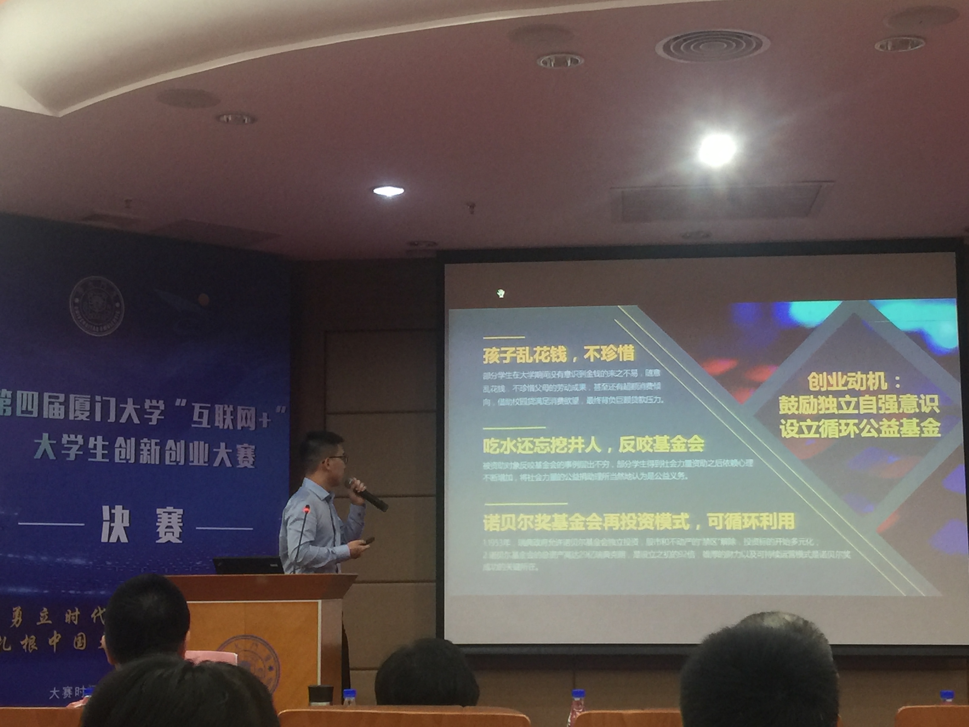此次大赛秉承培养“大众创业、万众创新”新生力量、把激昂的青春梦融入伟大中国梦的宗旨,鼓励各类行业背景下的创新创业项目参赛。国际学院的这支团队聚焦于如何创新性利用商业模式运营公益项目。他们一方面希望有效解决校友基金、公益基金以及校园贷款产品普遍存在的弊端,树立大学生独立自强、珍惜资源的意识,另一方面受到诺贝尔基金会运营模式的启发,最终萌生出创新性公益基金的理念,并在2016年底开始付诸实践:蓝子俊同学创立厦门晨星启辰投资管理有限公司和启辰公益基金会,基金会目前已吸纳校友基金、商会协会和社会企业家三方资金,致力于为在校生提供资金和社会资源支持,同时学生在毕业后按照工作收入的一定比例回馈基金会,部分回馈金额将为已资助对象提供额外增值服务如实习实践机会,剩余部分将用于资助下一批学生,以此形成价值链闭环。教育与社会的双向积极传导,由此实现。