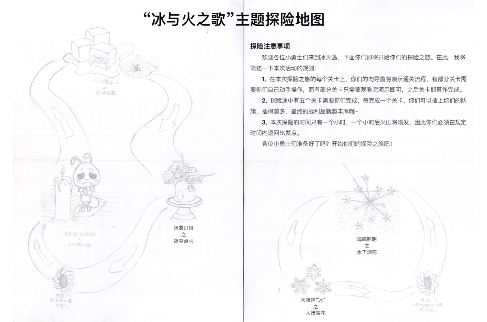 此次活动主题是“冰与火之歌”,青协成员设计了一个南方大陆的故事背景,以此背景展开的“探险活动”贯穿整个活动的实验,在生动有趣的氛围中将孩子们代入环境,在情境中学习科学。同学们还设计了“任务地图”以及插旗打卡的环节,让活动更加有趣味,营造出更逼真的探索感受。