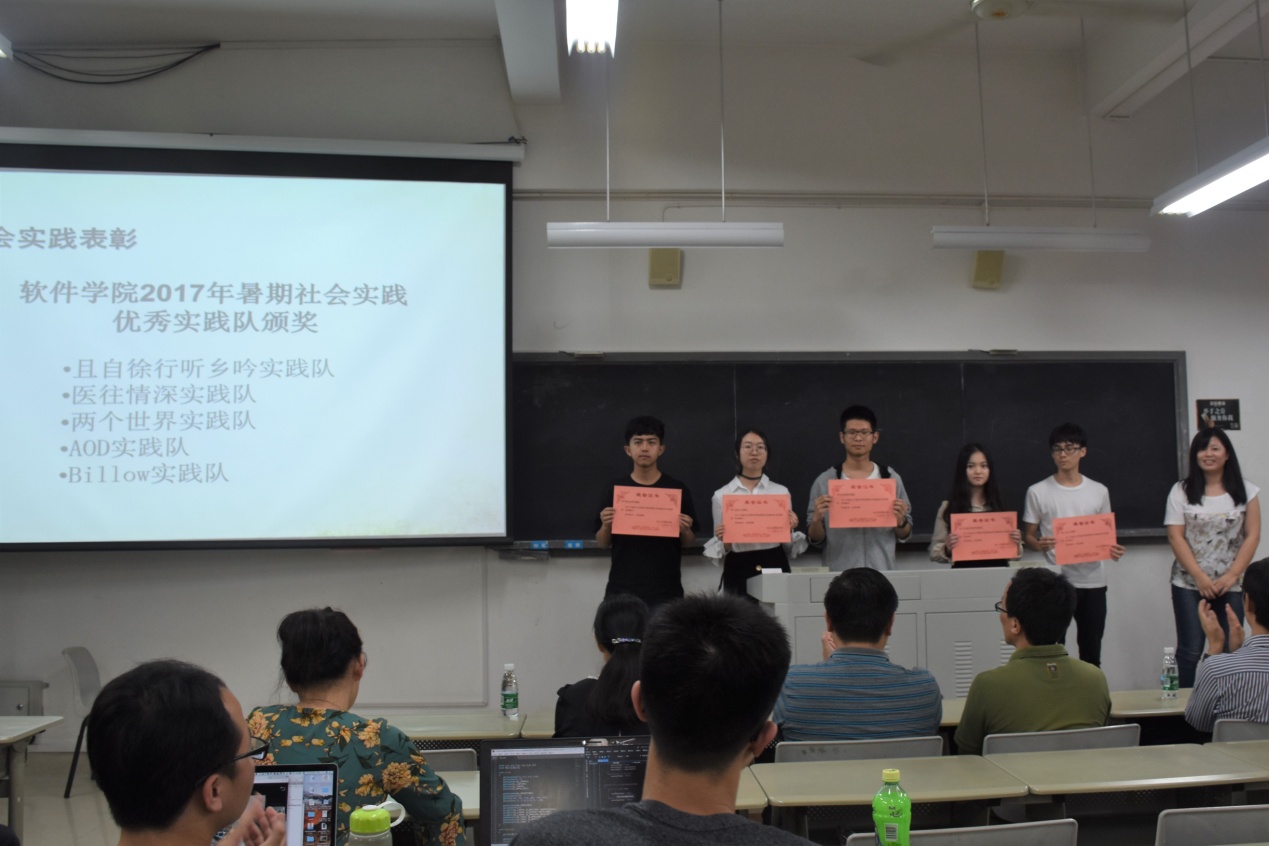 大会首先播放了软件学院2017年度社会实践活动短片,展示了软件学子一年来开展的精彩多样、充实丰富的实践活动以及取得的累累硕果。之后,现场公布了国家级、省级、校级和院级的各类个人和团队的表彰情况,并且为获得表彰的老师、同学和团队颁奖。