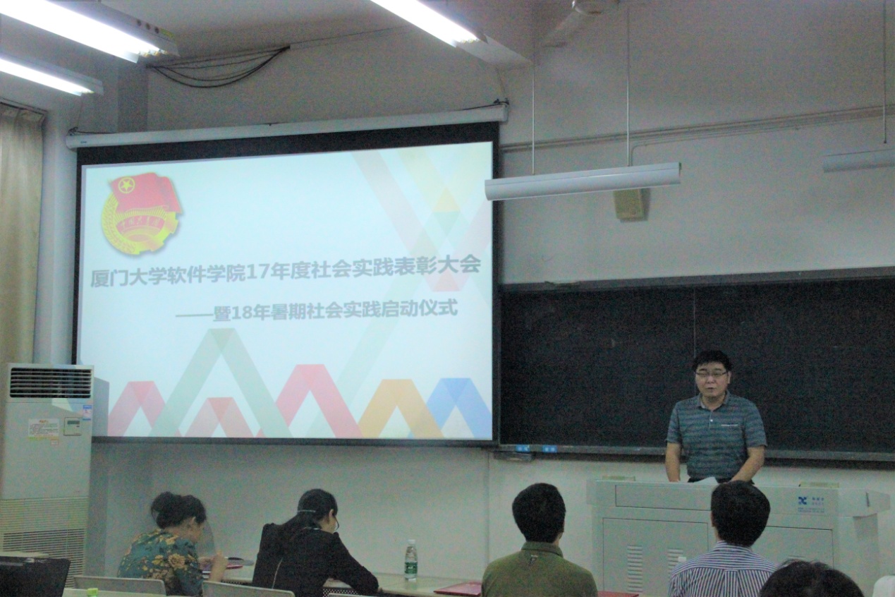 5月11日晚19:30,软件学院2017年度社会实践总结表彰大会暨2018年暑期社会实践启动仪式在海韵教学楼201教室成功举行。软件学院党委副书记史亮,数字媒体工程系教授林俊聪,数字媒体工程系副教授佘莹莹,软件工程系副教授刘昆宏,软件工程系副教授毛波,学院团委书记葛学凤,学院团委副书记李加冕、李绍玉,辅导员刘锦锗,以及受表彰个人和团队,和各年级同学代表参加了大会。