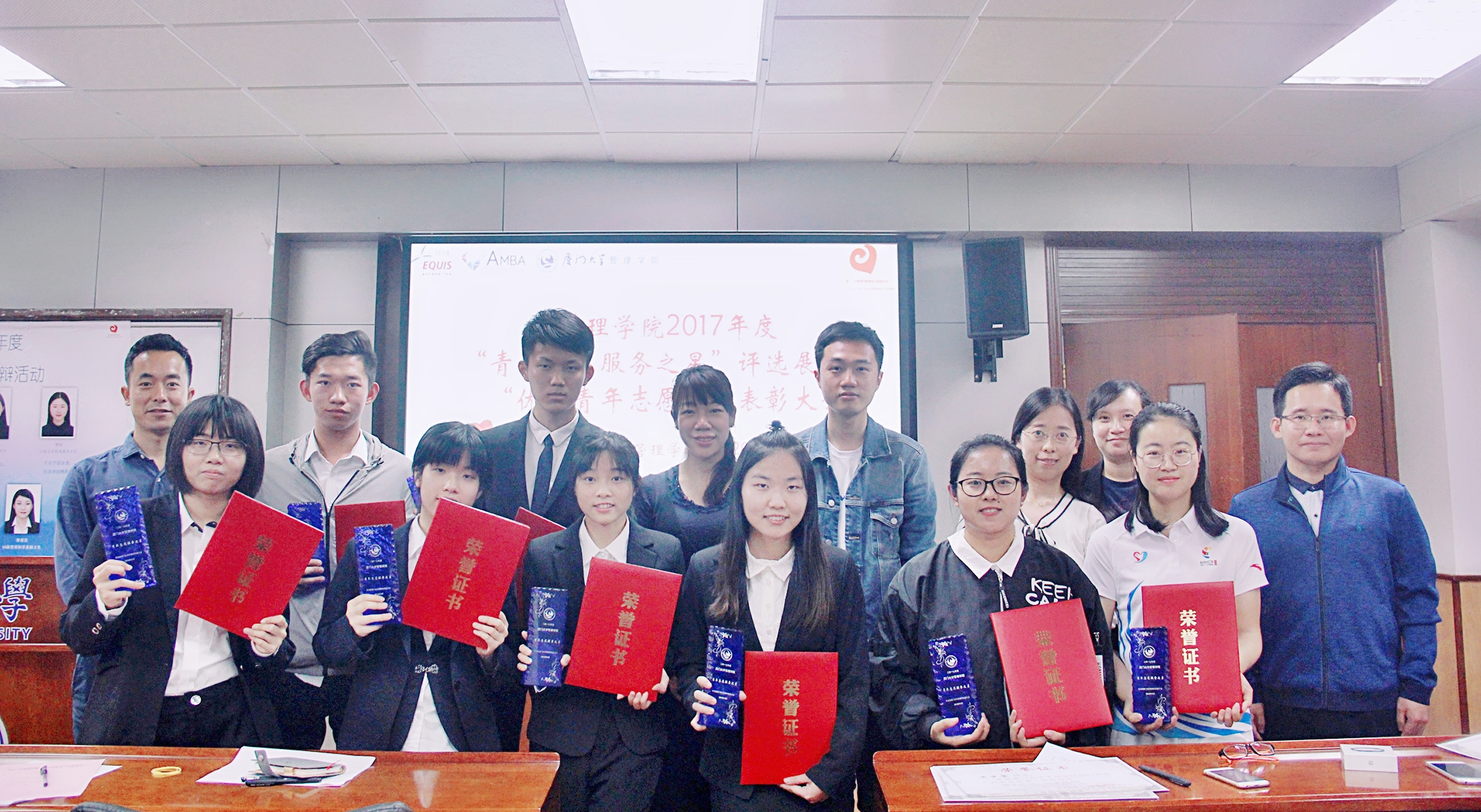 在2017年学校志愿志愿服务工作表彰中,管理学院斩获佳绩,管理学院青年志愿者协会荣获“优秀组织奖”,团委副书记吴光锡荣获“先进工作者”(指导教师);2015级本科生覃玲玲荣获“先进工作者”(学生负责人);2016级本科生翁承武荣获“十佳志愿者提名”;叶风等8名学生荣获“优秀志愿者”。“爱心拾翼”关爱自闭症儿童项目荣获“优秀项目奖”。