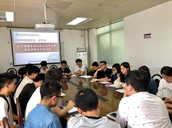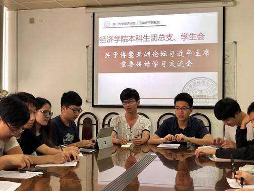 4月11日中午,经济学院团总支、学生会组织召开习近平总书记2018年博鳌亚洲论坛重要讲话精神理论学习会,专题学习了习近平总书记4月10日在博鳌亚洲论坛上的重要讲话精神。经济学院团总书记张毅农、经济学院学生会主席梅亦腾等学院学生会主要干部出席会议,会议由学院学生会主席梅亦腾主持,学院学生代表参与会议。