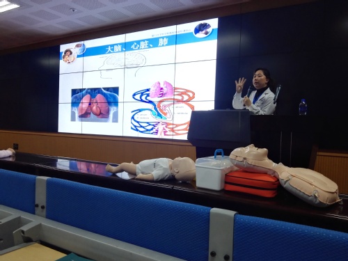 讲座开始,余丹老师通过具体数据与详细案例向大家介绍当前社会大众急救技能匮乏的情况,从而引起同学们对急救知识的重视。接着她从心肺复苏术与海姆立克急救法两个方面对校园急救进行了讲解。