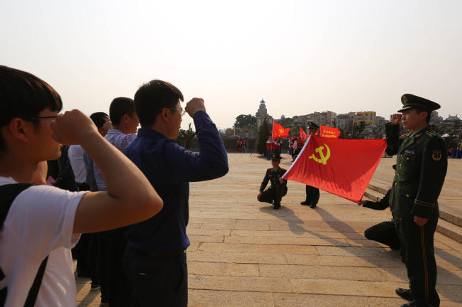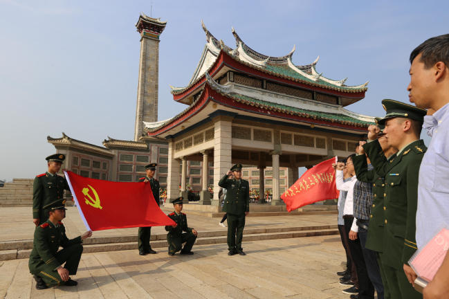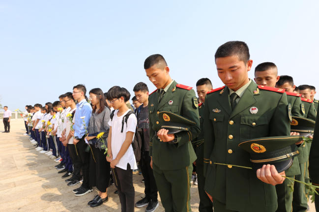 接着,刘五店中学新发展团员面向团旗举行入团宣誓仪式。随后,三方新老党员面向党旗,进行了重温入党誓词仪式,在庄严的仪式中,不忘来时路,奋起新时代。最后,全体师生、官兵向嘉庚墓献花。