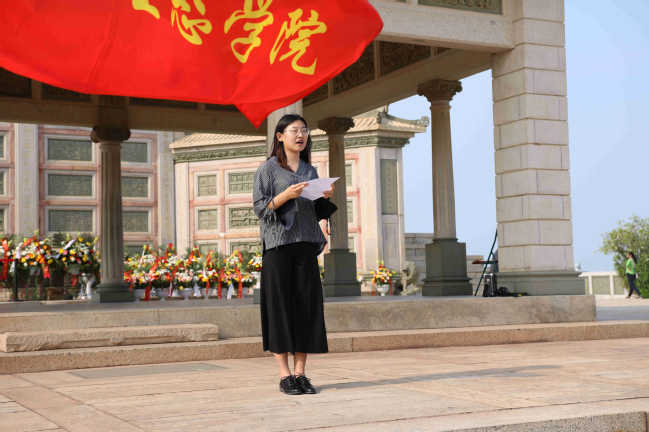 海警三大队指导员蔡荣锟介绍了解放集美英烈事迹。师生、官兵了解到,在中国共产党的领导下,解放军通过艰苦卓绝的斗争,以“宁可多流血也要保护学村”英雄气魄成功解放集美,用轻武器、用血肉之躯、用生命诠释了解放军服从命令听从指挥的天职,81名军人用生命书写忠诚,永远长眠在侨乡集美。刘五店中学郑美家老师介绍了陈嘉庚事迹。师生、官兵学习了解放集美纪念碑的四层阶梯数目所代表的历史内涵,有感于陈嘉庚先生以毕生精力投身于解放事业、教育事业的热忱和精神。厦门大学环境与生态学院2016级环科班团支书苏子萌作为学生代表发言。她鼓励同学们铭记先烈遗志,继承发扬他们的革命精神和英雄气概,立足当下,努力学习,奋发图强,用我们的智慧和才干去完成新时代赋予我们的神圣职责。