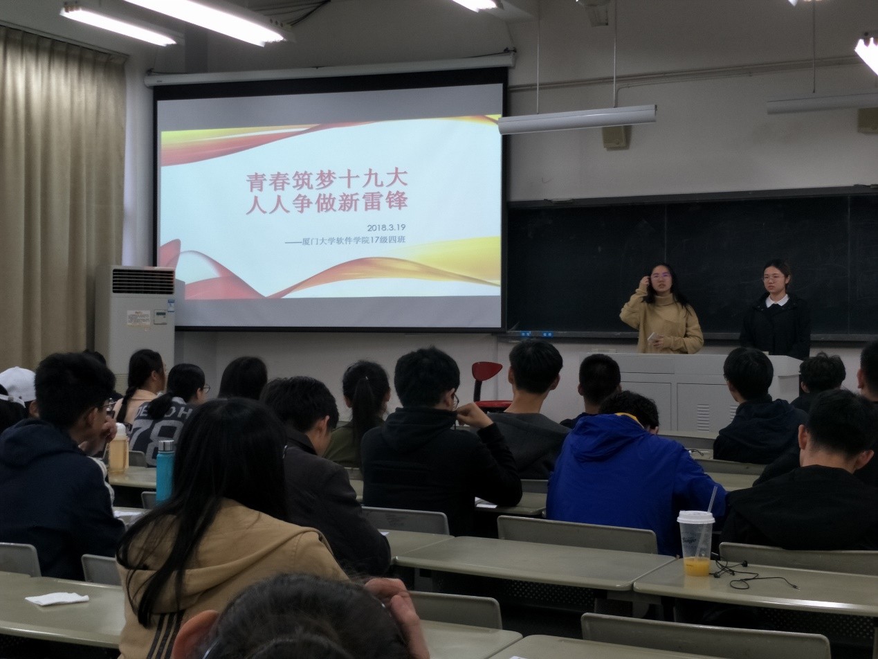 本月十九号下午,本科17级软件学院四班全体团员在海韵教学楼201开展了本学期第一次团课,本次团课不仅鼓励同学们学习、发扬雷锋精神,推动全体团员争做新雷锋、发现并弘扬雷锋事迹,且展开了对党的十九届三中全会及2018年全国两会精神的学习和思考。
