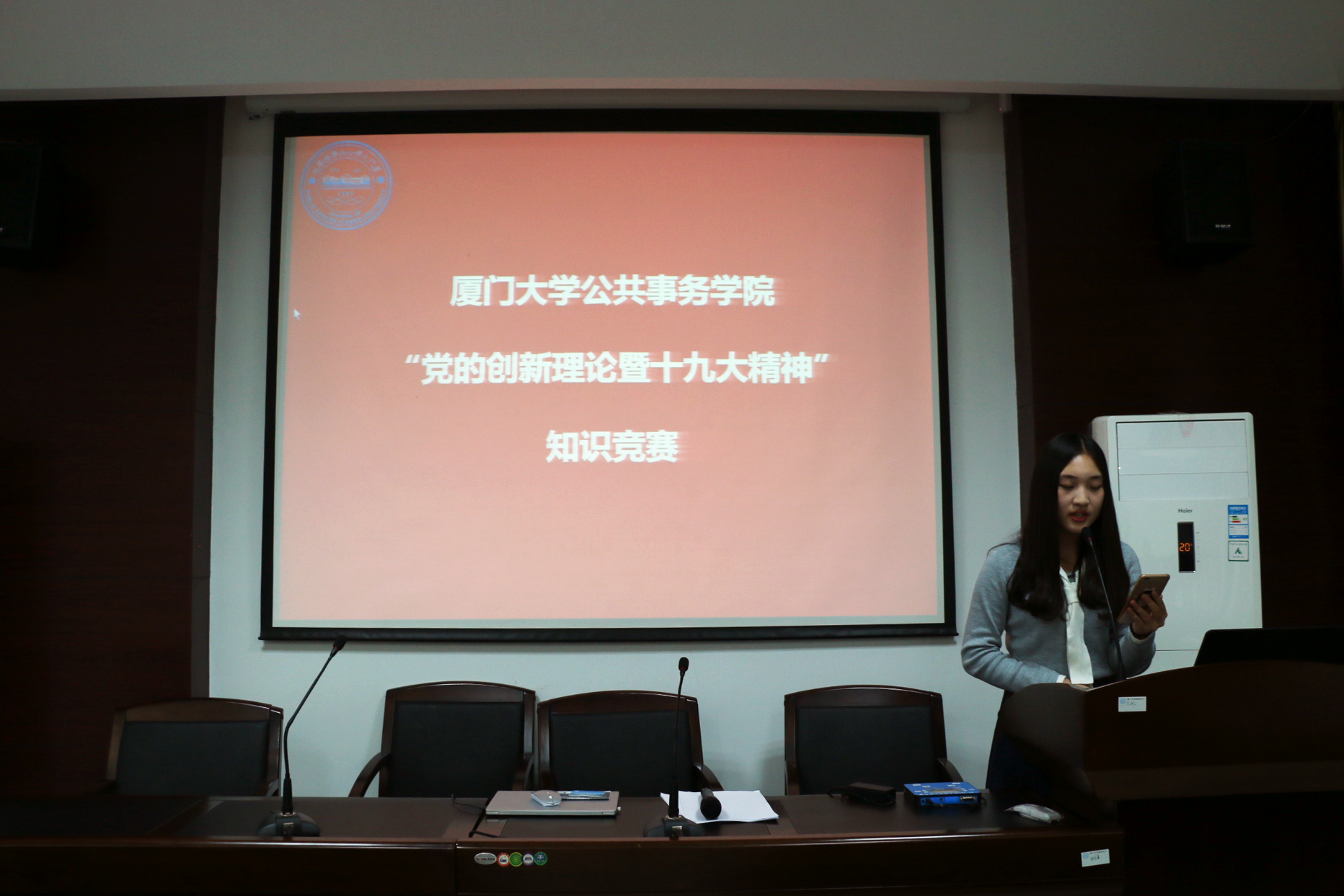 2018年3月6日星期二晚19:30,在成智二109举办了公共事务学院“党的创新理论暨十九大精神”知识竞赛,学院团委书记徐莹、团委副书记蒋慧琼出席了本次活动。本次知识竞赛是学院内部的一场选拔赛,成绩优异者将代表学院参加校级的比赛。入围本次竞赛的22名同学,也是在学院参与十九大精神的网上知识学习、练习和竞答的200多名同学中成功脱颖而出者。