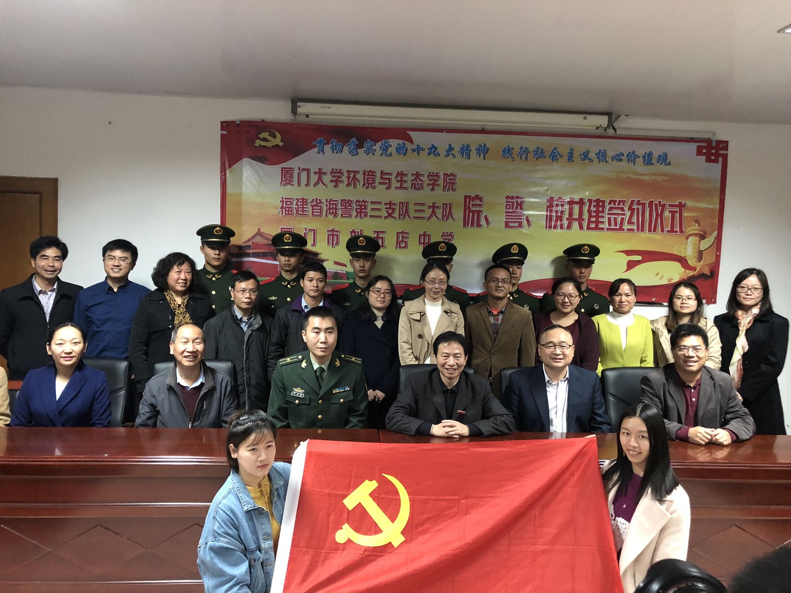 为深入贯彻落实党的十九大精神,响应“生态文明建设”号召,进一步推进海洋环境保护、青少年科技教育创新与党建交流工作,也为大学生实习实践搭建平台,1月4日下午,厦门大学环境与生态学院、福建省海警第三支队三大队、厦门市刘五店中学三方共建协议签订仪式在刘五店中学举行。厦门市翔安区委教育工委书记、局长林佳跃,海警第三支队三大队政委杨平通,环境与生态学院党委副书记周克夫、许美霞,厦门市刘五店中学校长宋火金,以及来自环境与生态学院生态学系教工党支部、实验教学中心教工党支部和厦门大学生态文明学生研习社的师生们,福建省海警第三支队的官兵们、厦门市刘五店中学的师生代表参加了仪式。仪式由刘五店中学朱跃忠副校长主持。