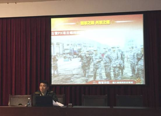刘上校首先指出,民族要复兴,就必须要强军兴军。在十八大以来极不平凡的五年时光里,国防和军队改革以及国防科技装备建设都是在习近平强军思想的指导下完成。其次,当今的中国军队建设正站在一个新的历史起点上。刘上校列举了过去一年里国际上发生的“黑天鹅”事件,而同时,中国国内的经济实力、科技水平、军事实力和综合国力等方面都有了前所未有的发展和突破。再次,在新的起点上,对军队建设也有了更高的要求和目标,为此我们要不断推进我国军队的机械化和信息化建设,着力解决好统一问题、边境问题和海洋权益问题。最后,刘上校落实到如何兴军的有效举措上来,即“回归军队本质”、“强化本职”和“还原本色”。当然,在强军之路上,有许多英雄的军人光荣地牺牲,刘上校感慨地说道:“因为有他们的负重前行,才有祖国的‘岁月静好’。”引起了师生们热烈不断的掌声。