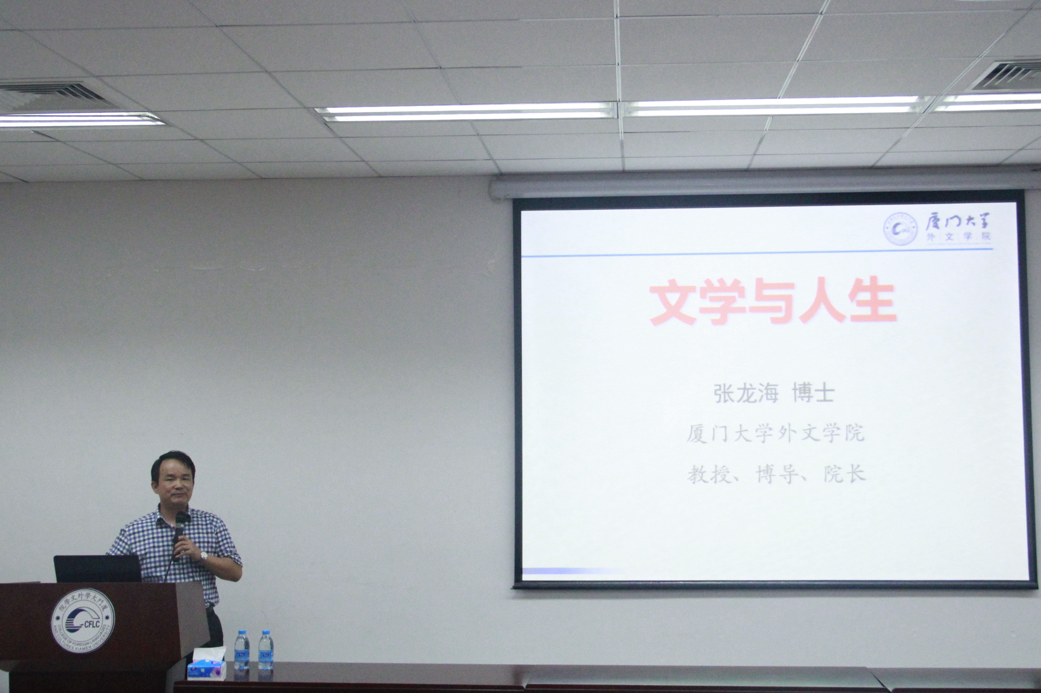 10月13日晚7点,外文学院院长、博士生导师张龙海教授在南光三112报告厅给2017级本科新生带来了一场主题为“喜迎十九大·文学与人生”的研讨课,由英语语言文学系副主任林斌教授主持。2017级本科生辅导员蔡宇老师及全体本科新生出席。