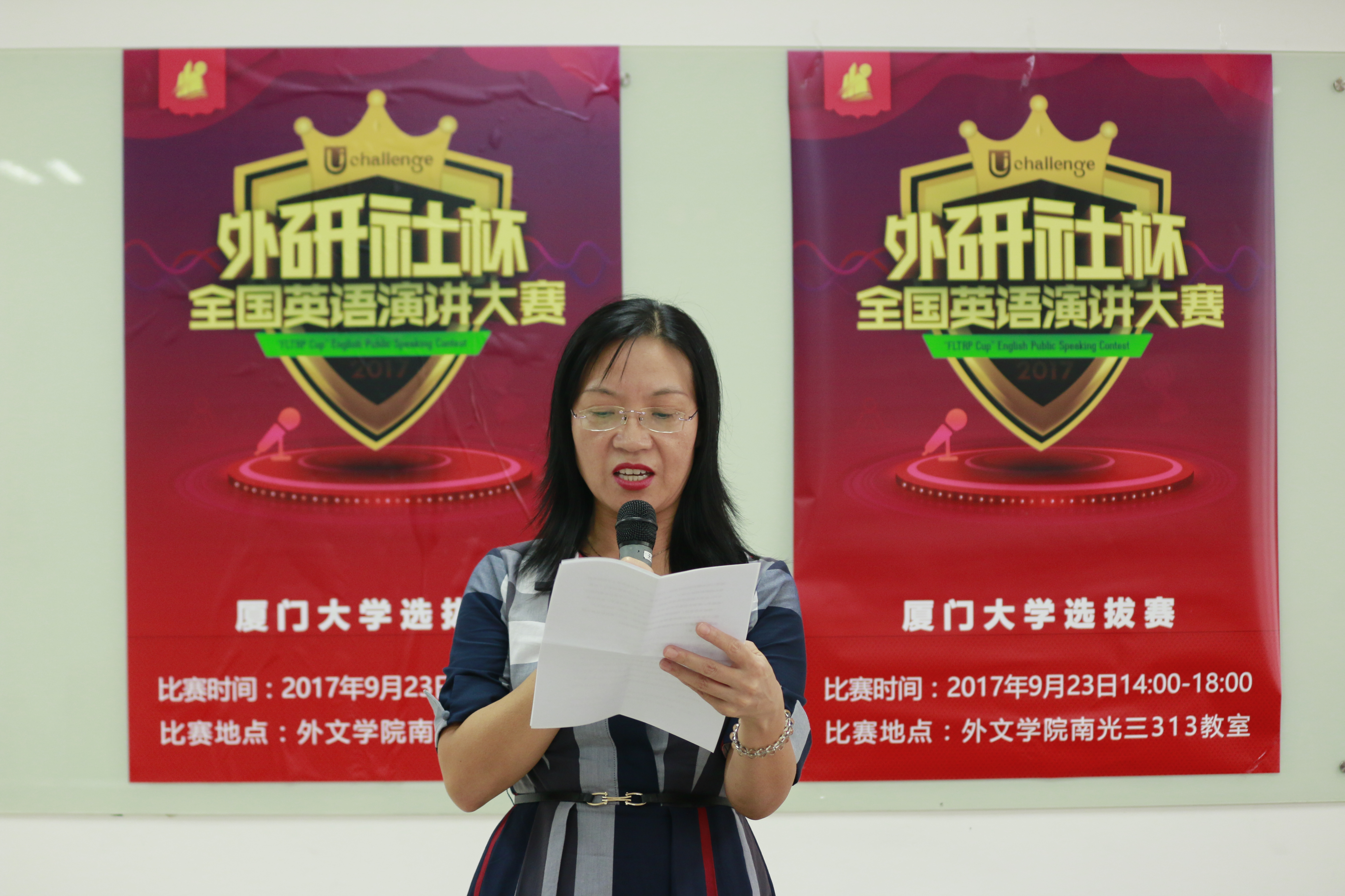 李美华教授首先致开幕辞。李老师对活动的主办方、承办方、评委嘉宾和所有工作人员表示了感谢,重点介绍了“外研社杯”全国英语演讲大赛的历史和厦大外文学子在历届比赛中的精彩表现,并预祝外文学子们在本届比赛中取得优异的成绩。