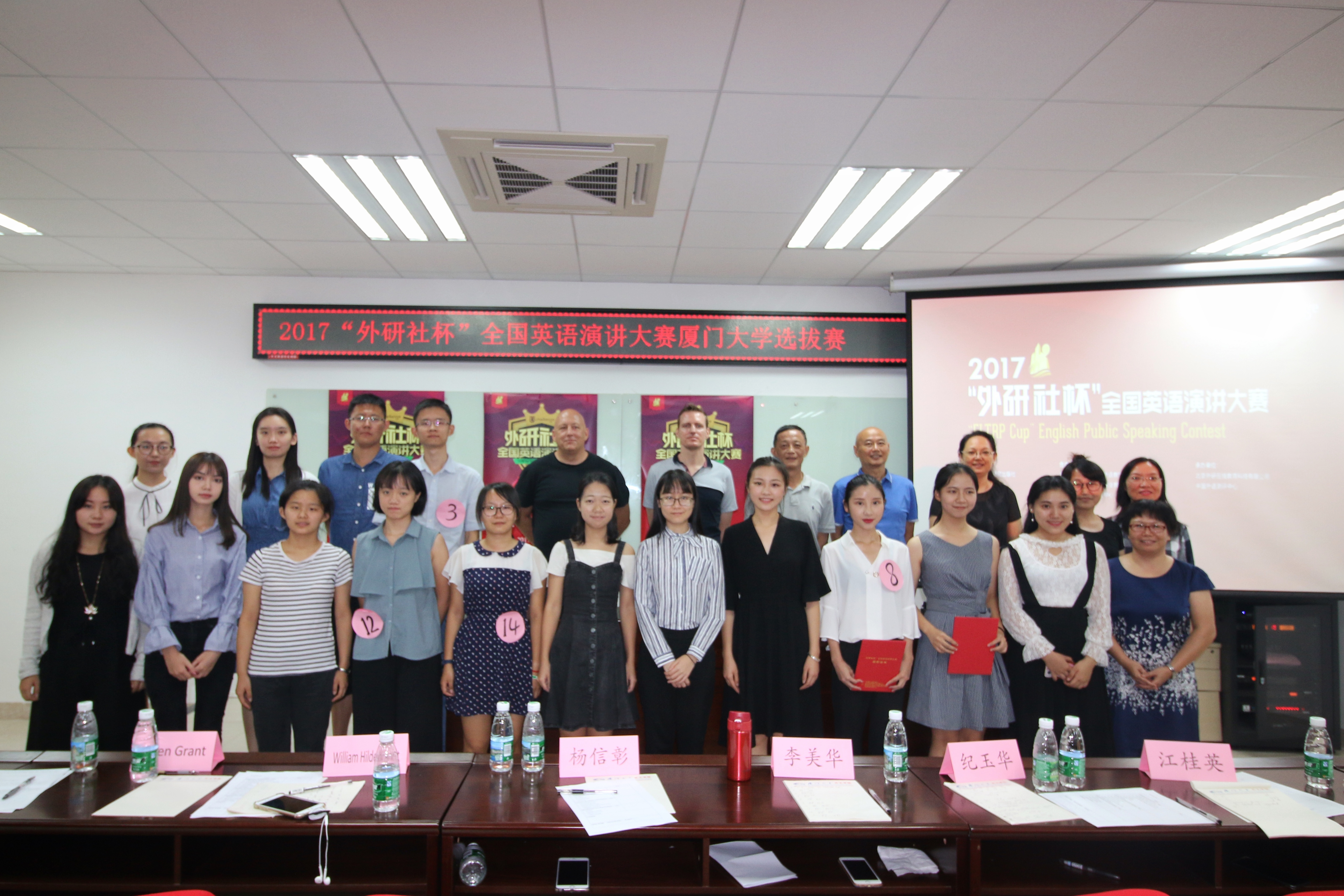 9月23日下午2点,“外研社杯”全国英语演讲大赛厦门大学选拔赛在外文学院三楼报告厅顺利举行。经过初选,共有14位选手凭借其出色表现晋级本次选拔赛。外文学院副院长李美华教授,英语系杨信彰教授,外语教学部主任江桂英教授、副主任李素英教授,英语系纪玉华教授以及外籍教师Jasen Grant、William Hildebrandt作为评委出席本次大赛。