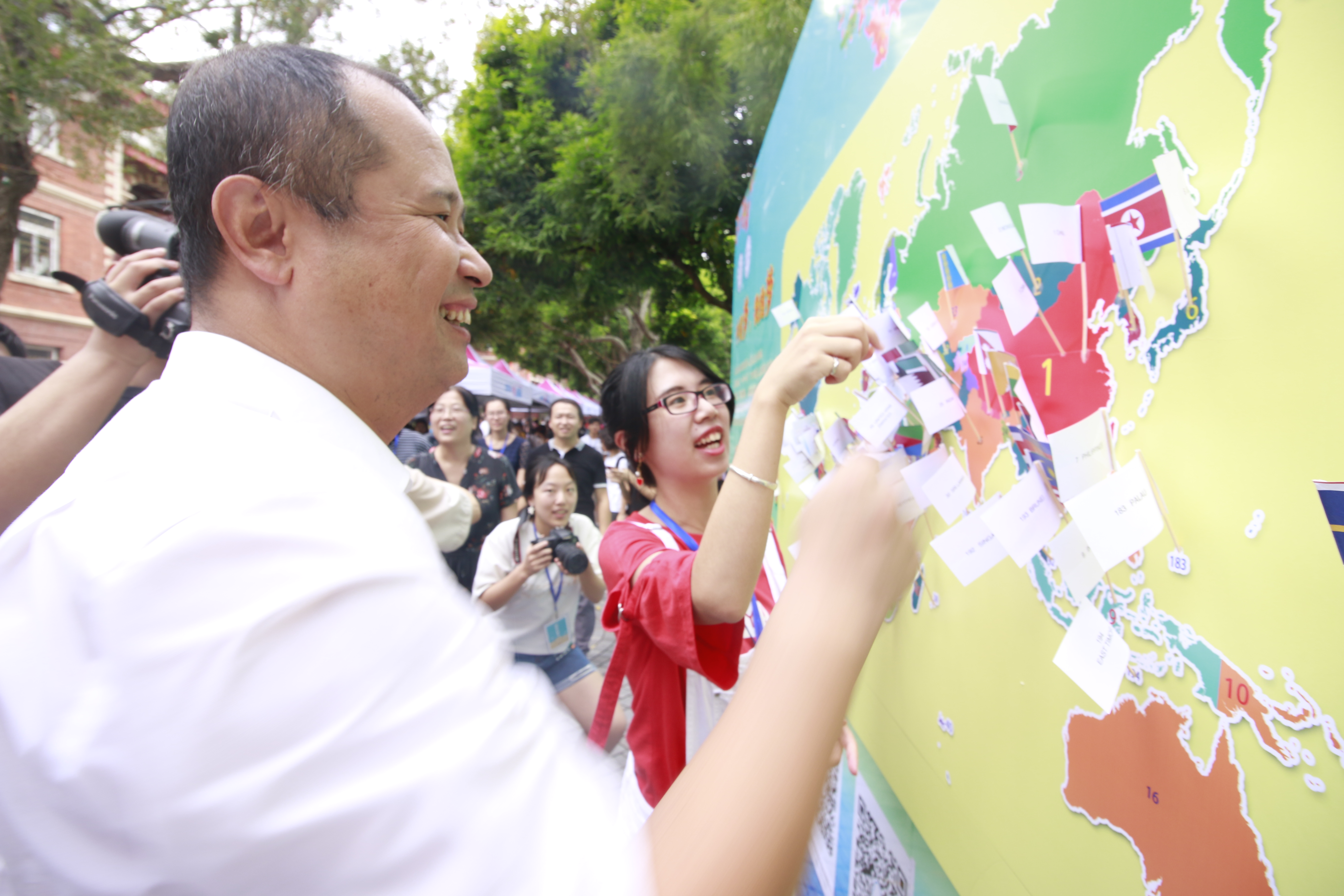 第一天上午10点左右,张荣校长、林东伟副书记来我院迎新点了解迎新进展,对前来报到的同学们表示慰问,询问了新生的基本情况,并与在场的外文师生亲切交流。在我院师生的盛情邀请下,张荣校长和林东伟副书记还亲自参与了“中国梦,我的梦”活动,在世界地图上插上了中国国旗。张荣校长表示,“世界眼光”和“家国情怀”对外文学院的学生意义深远重大,希望所有外文师生都能将此次参加厦门金砖会晤的服务奉献精神传承下去,在国际性舞台上发挥越来越重要的作用。
