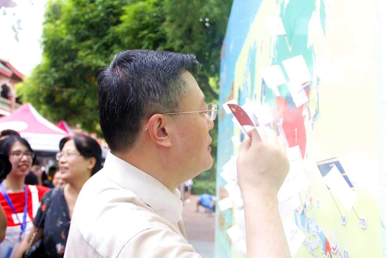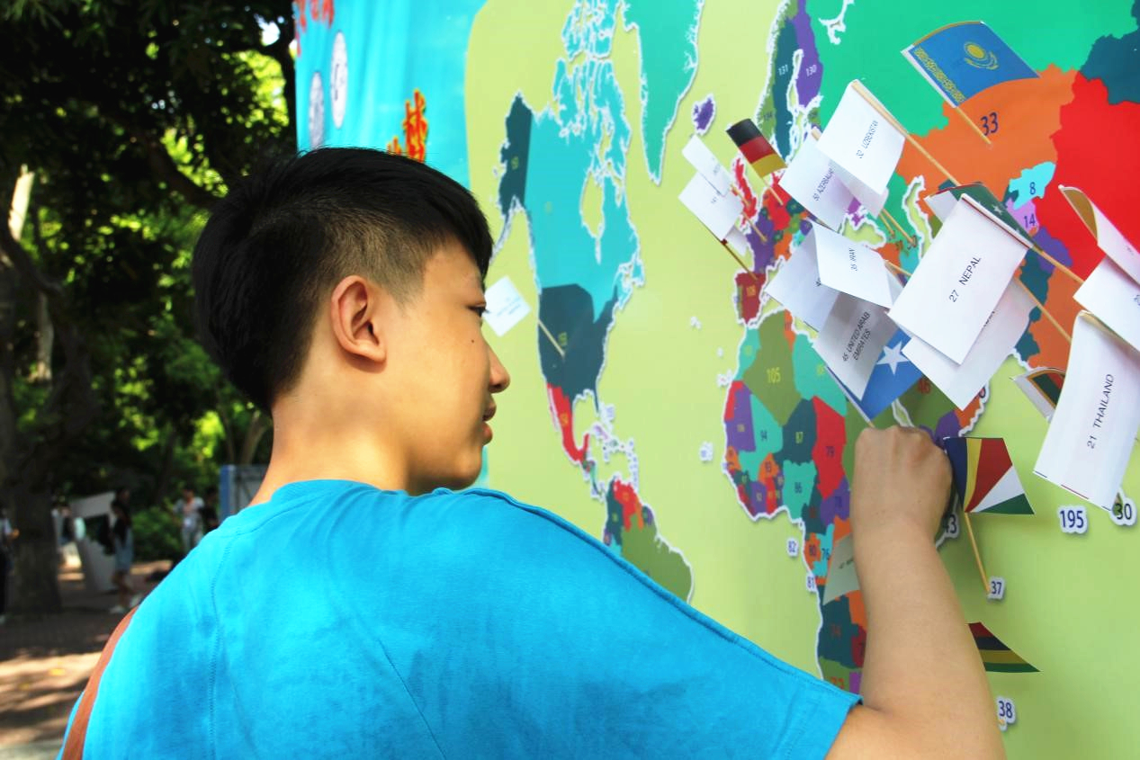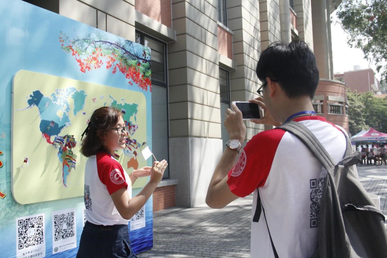 为了给2017级新生的入学第一天留下美好回忆,学院延续往年传统,为新生准备了独具特色的迎新活动。在印着完整世界地图的“中国梦,我的梦”背景板前,新生们自己挑选一个国家的国旗,并按照该国的所在位置将国旗插在世界地图上并与之合影留念。一个上午过后,五颜六色的各国国旗已经密密麻麻地插满了大半张地图,吸引了众多好奇和艳羡的目光。