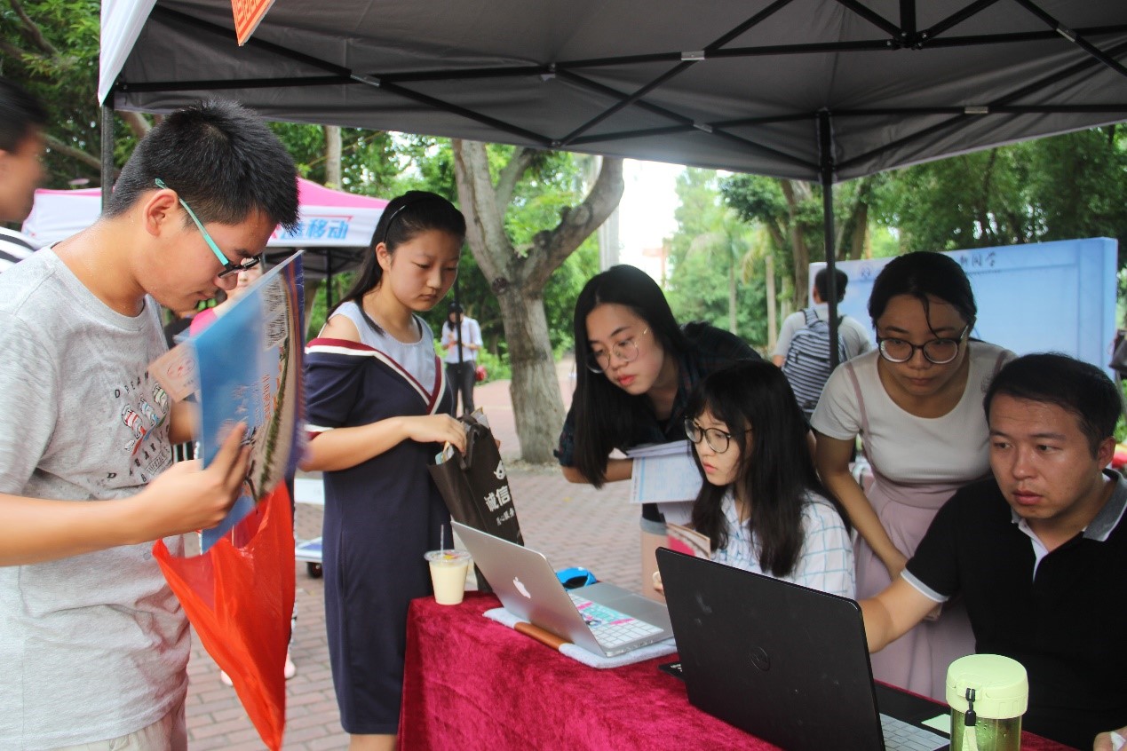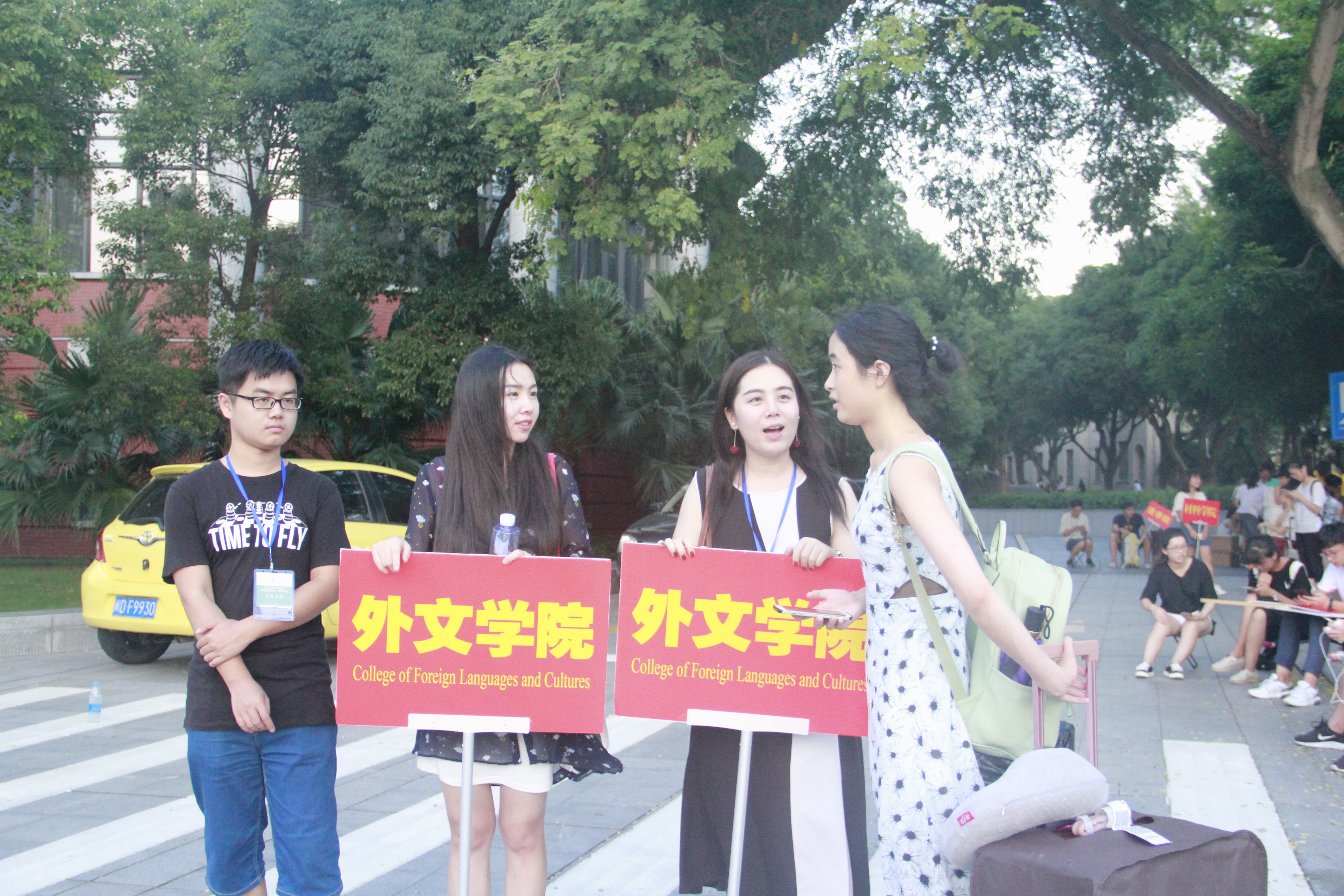 在炎炎烈日下辛勤忙碌的,除了注册组的志愿者们,引导组、行李组和宣传组的同学们也在烈日下辛勤地忙碌着。引导组的同学们高举外文学院院牌在校门口等候新生并将他们引导至迎新点;还有些引导组的志愿者来往于与注册点与宿舍之间,为新生们带路并介绍校园;行李组的同学们则守在行李运送点,为新生们送行李并仔细做好登记领取工作;宣传组的同学在世界地图前为每个新生拍照留念,将他们初进校园的灿烂笑容永久保存在相片之中,并引导新生们和家长们扫码关注外文学院官方微信平台“厦大外文CFLC”获取学院的最新资讯。