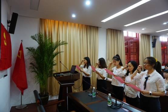 随后进入新党员宣誓环节,我院2015级研究生黄廷凤、张瑶、王晓宇与杨慧敏四位同学在2015级党支部书记王月同学领宣下,面对党旗庄严宣誓,并在誓词上郑重签下了名字。