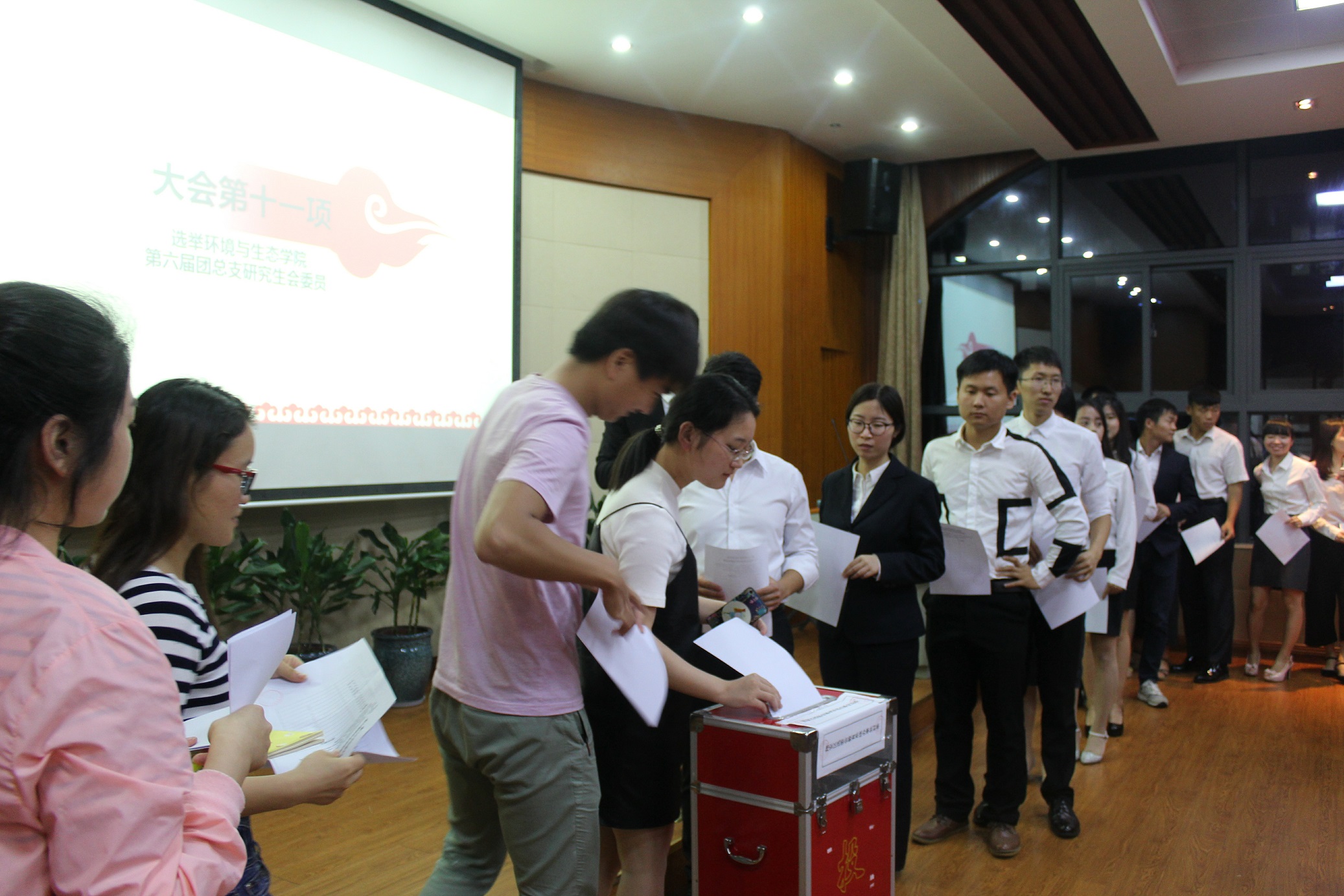 之后,主持人宣读了我院第六次研究生代表大会选举办法,紧张有序的新一届环境与生态学院团总支研究生会委员竞选演讲接踵而至。共有十一位参选人先后进行了各具风采的竞选演讲,展示了他们愿为同学和研会服务的意愿并对以后的工作进行了展望。大会严格按照选举办法进行了投票选举,最终产生环境与生态学院第六届团总支研究生委员会委员。