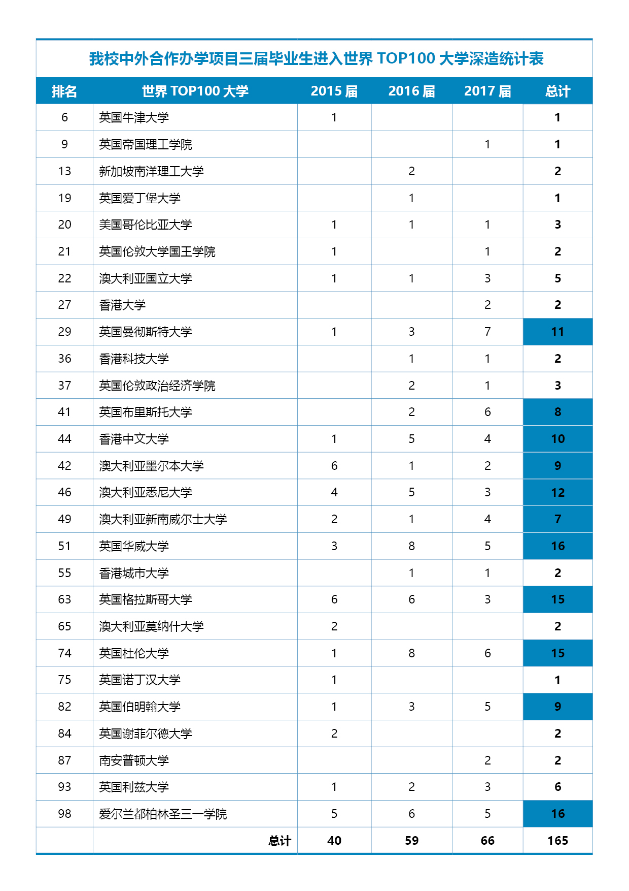 根据2016-2017QS世界大学排名,我校中外合作办学项目3届毕业生进入世界前100名大学攻读硕士及直博研究生人数已达165人。具体录取学校及录取人数分布如下: