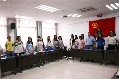 512日中午1240分,外文学院纪念建团95周年系列活动之“不忘初心跟团走,重温入团那一天”在南光三415教室如期举行。学院团委书记、研究生辅导员乐无恙老师,团委副书记、2016级本科生辅导员肖盈老师,2015级本科生辅导员周晓牧老师,2013级、2014级本科生辅导员杨盛澜老师以及兼职辅导员们出席了本次活动。外文学院2016年度优秀共青团员、优秀团支书和2017年新发展团员悉数到场。活动在庄严的国歌声中开始。