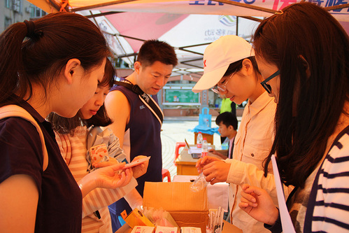 期间,活动现场迎来了几批出游的初中生。虽然由于年龄较小,同学们遗憾地未能献出自己的一片心意,但“诠释爱”的队员们以及志愿者热情地向他们详细介绍了本次活动的内容和意义所在,相信他们未来也会为中华骨髓库的充实做出一份贡献。此外,本活动还得到了一位来自深圳南山区招商街道感恩献血志愿工作队的专业人员的关注与指点,相信以后造血干细胞采集活动会办得更加理想、硕果累累。