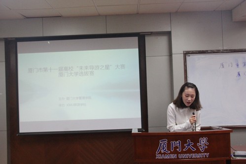 4月16日,由教务处、管理学院主办,旅游学社承办的2017年厦门市第十一届高校“未来导游之星”大赛厦门大学选拔赛成功举行。旅游与酒店管理系副教授伍晓奕以及校外导师吴天山、胡珺担任“导游词讲解”环节评委,管理学院团委副书记吴光锡、兼职辅导员陈啸担任“才艺展示”环节评委并出席颁奖仪式。