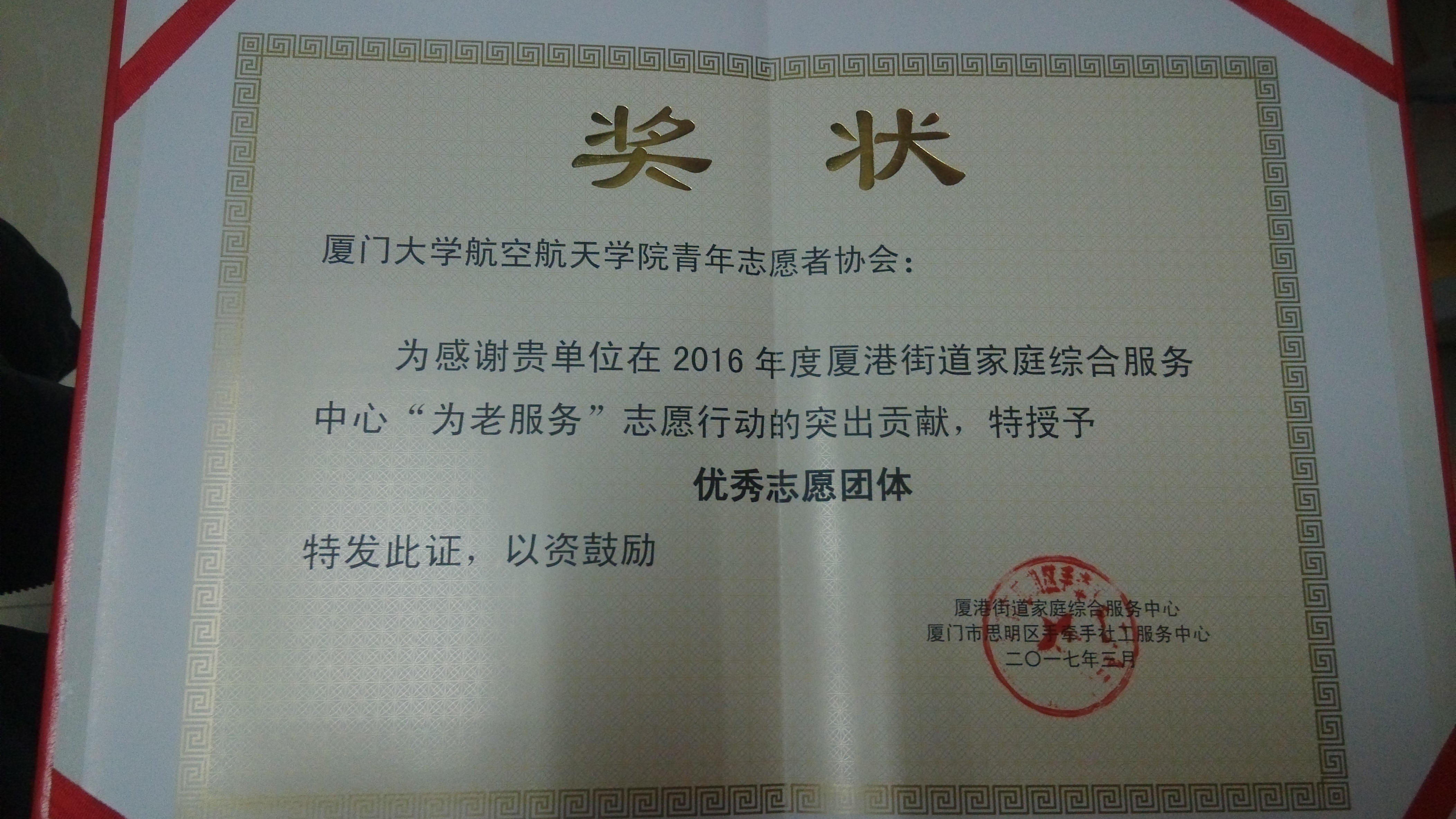 嘉许礼活动上,我院青年志愿者协会获得了“厦港街道家庭综合服务中心”与“厦门市思明区“手牵手”社工服务中心”联合颁发的“优秀志愿团体“奖项。这背后凝聚着我们一年来的努力,更是见证了几年来我院青协为社区所做出的贡献,同时也是对我们真诚的服务以及积极的组织工作给予了最大的肯定。