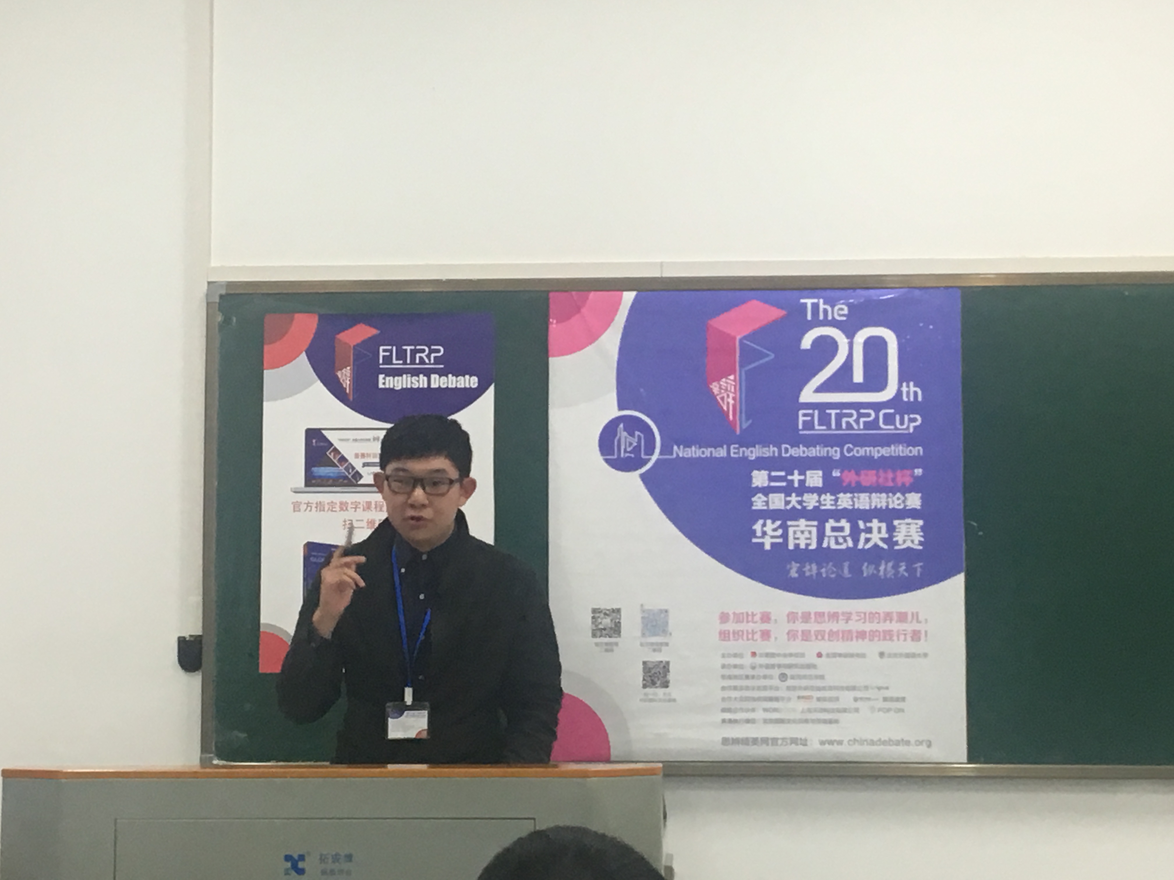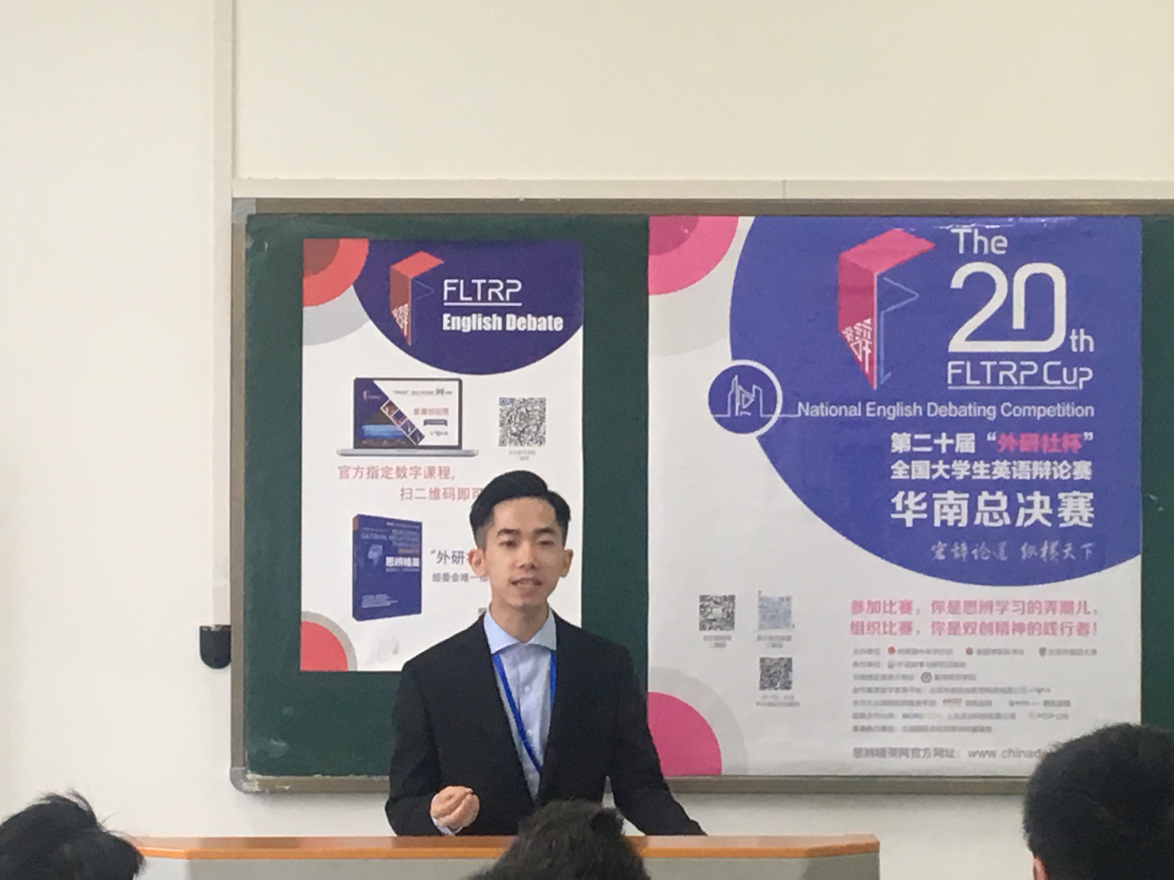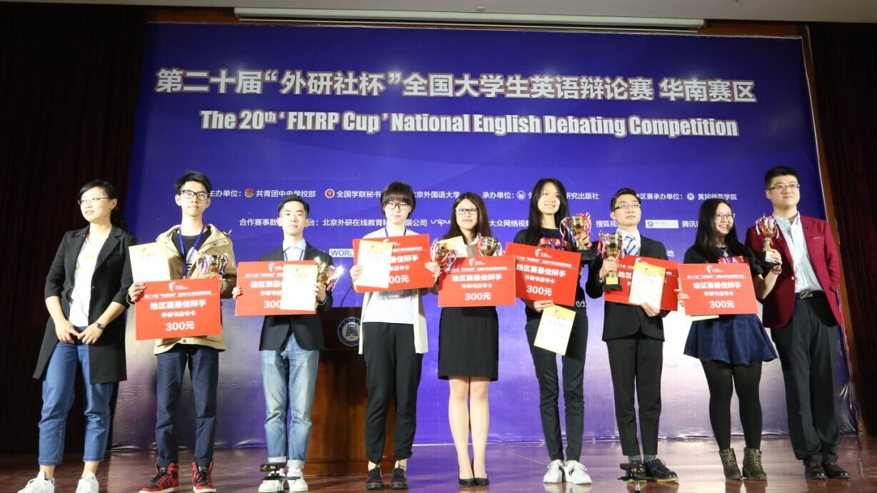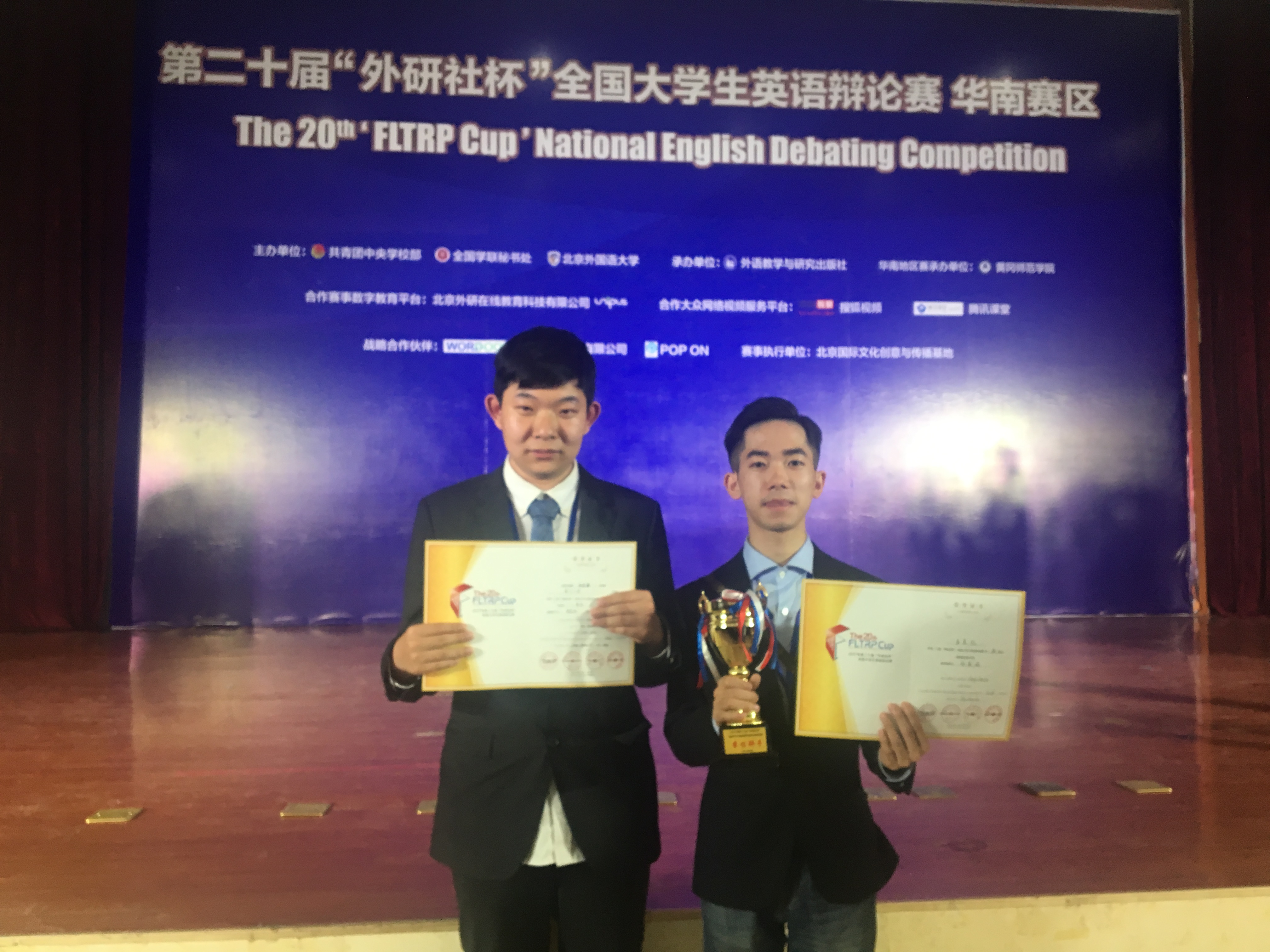 本次华南赛区决赛采取循环积分赛制,共历时三天,第一天为模拟赛,第二、三天为循环赛。循环赛共有五轮,赛程紧凑,赛题广泛,涵盖了世界文化、政治、法律、社会等热点问题,因此参赛选手在比赛中必须具备良好的抗压能力、丰富的背景知识储备及缜密的思辨能力。在前两轮的比赛中,两位选手思维清晰,逻辑缜密,妙语连珠,论证有力,连续拿到小组第一;第三轮比赛中,对手实力强劲,加上辩论位置的不利,我校代表队该场分数暂时居后;在第二天的比赛中,我校选手及时总结经验教训,凭借优秀的辩论技巧和出色的应变能力,成功突围,分别取得了小组第一和第二的好成绩。最终,我校代表队在华南赛区决赛中总积分排名第四名,荣获一等奖,成功晋级五月下旬在北京举行的全国总决赛。