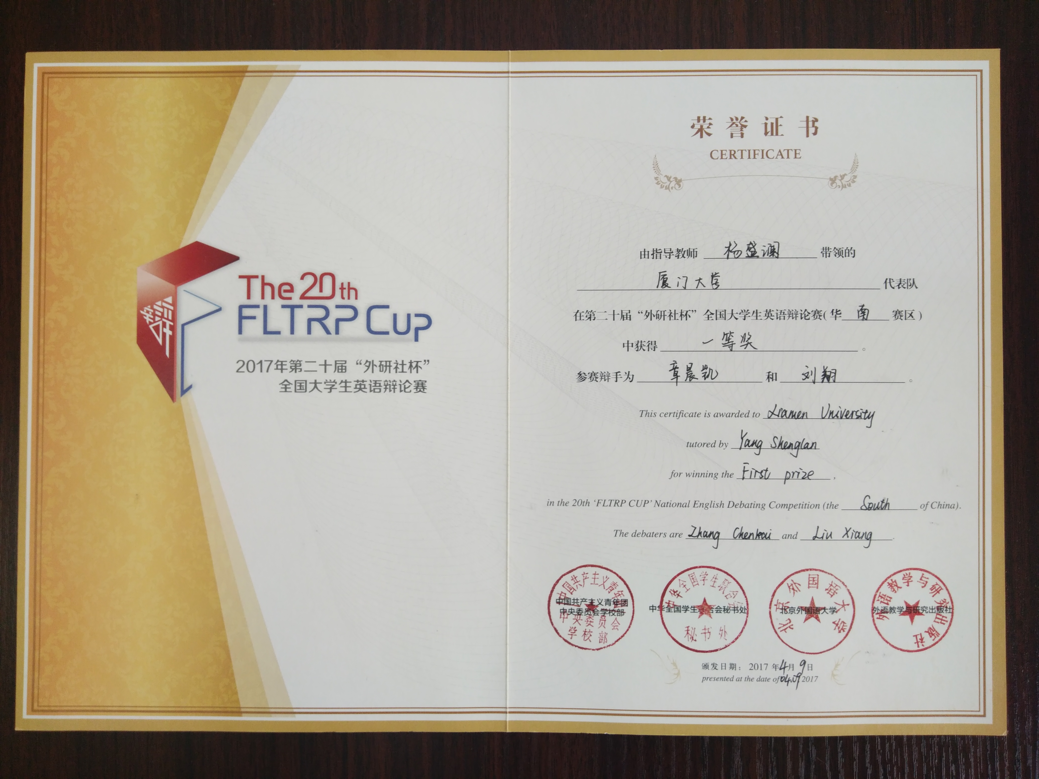 4月7日至9日,由共青团中央学校部、全国学联秘书处和北京外国语大学主办,外语教学与研究出版社、黄冈师范学院承办的第二十届“外研社杯”全国大学生英语辩论赛华南赛区决赛在湖北省黄冈市黄冈师范学院成功举办。由外文学院2016级英语口译专业硕士研究生章晨凯和2015级英语专业本科生刘翔组成的厦门大学代表队,经过五轮循环赛,在参赛的110余支队伍中团队总分排名第四,最终荣获一等奖并顺利晋级全国总决赛。其中,章晨凯在220余名辩手中积分排名第六,荣获“最佳辩手”称号。