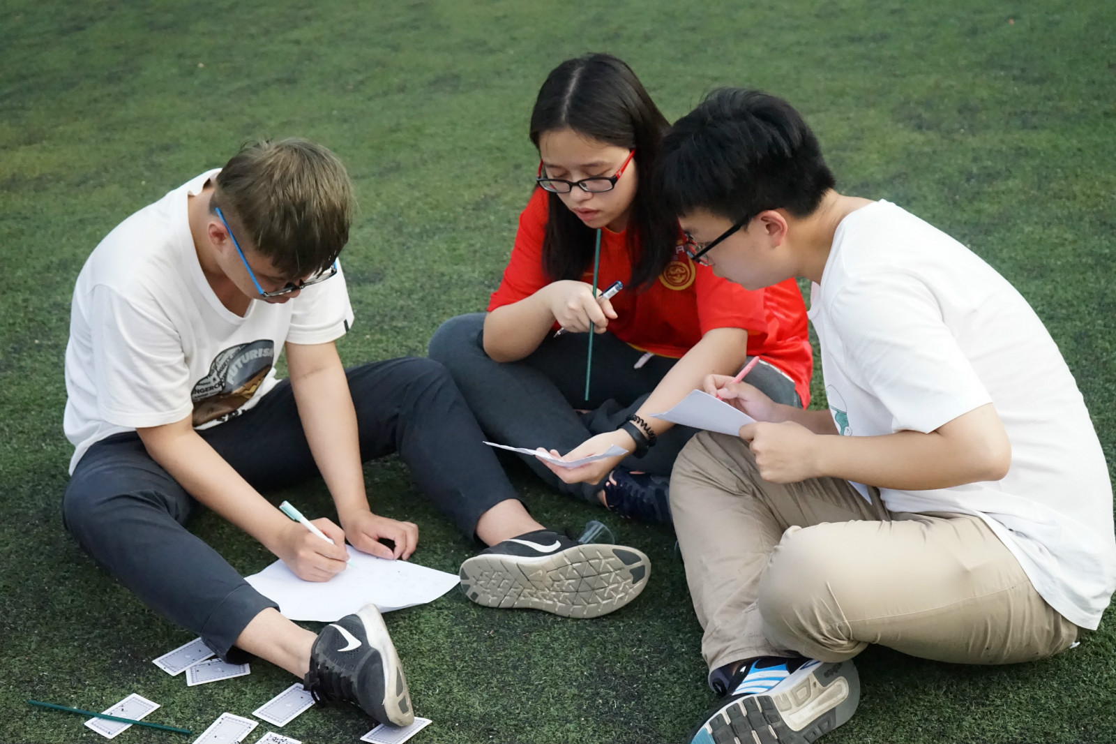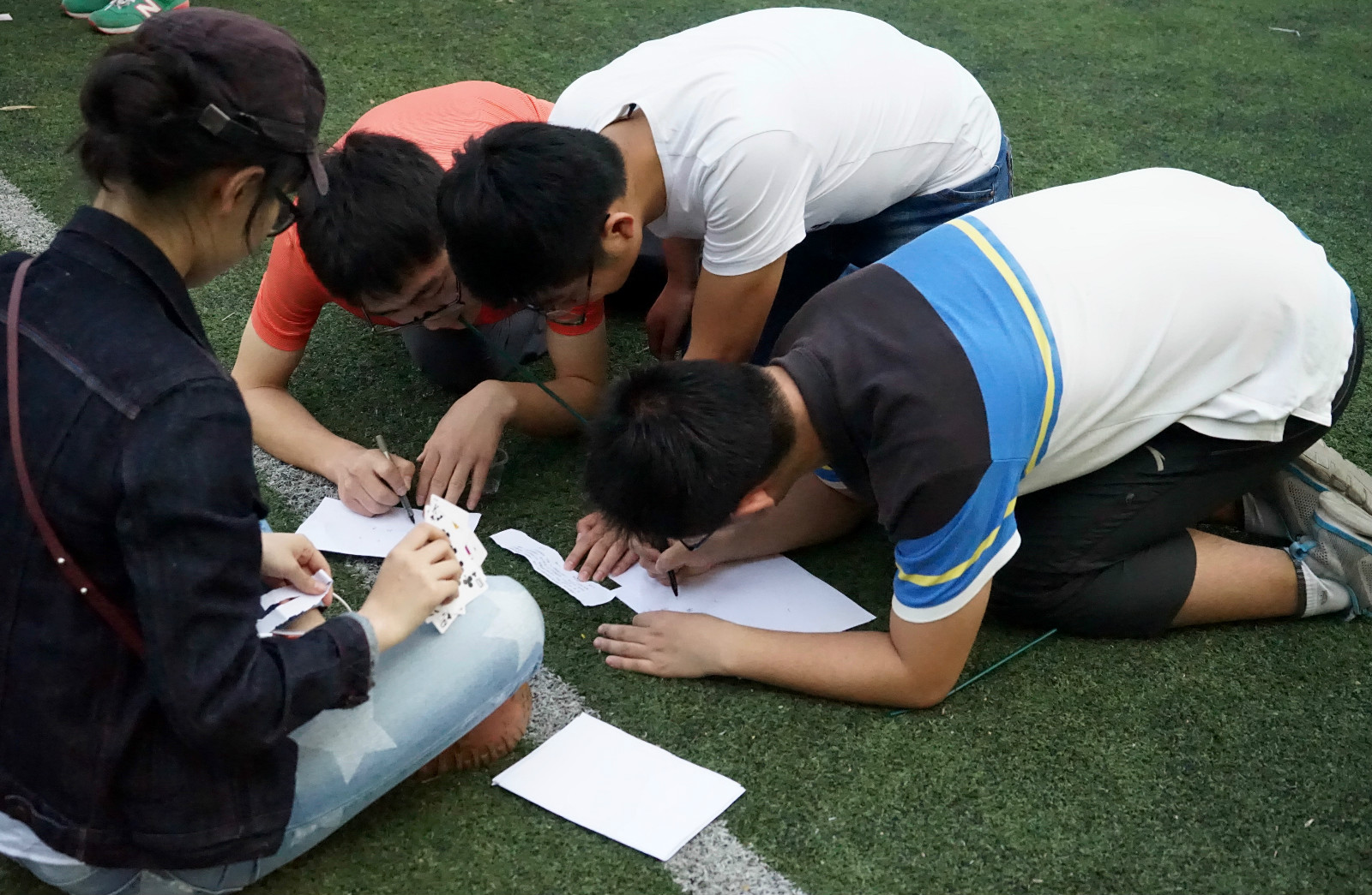 逻辑推理与答题闯关同样趣味无穷,妙不可言。每组的三个战友们凑在一起,在纸上写写画画,阳光撒在笔尖,纸张沙沙做响。他们认真而投入,齐心而协力,正是风华正茂的模样。