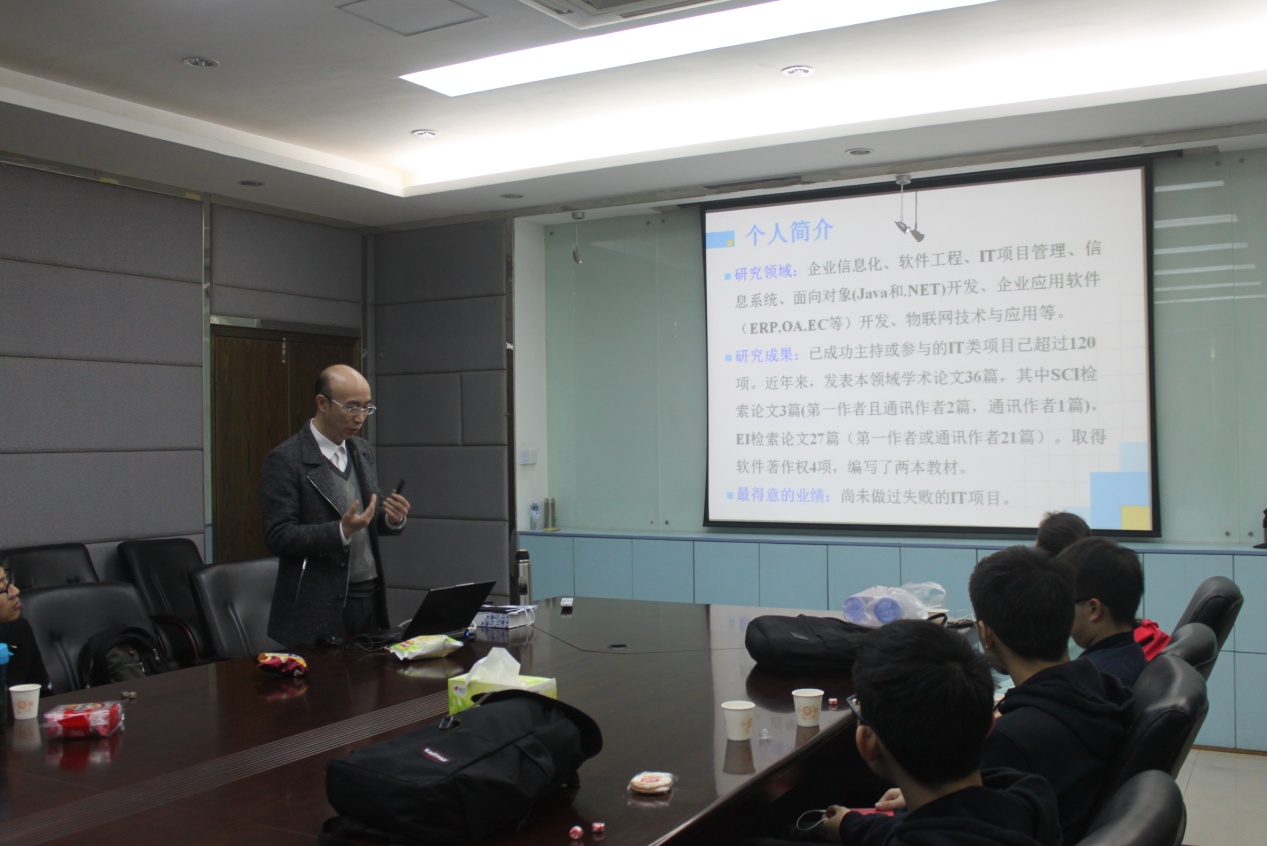 随后,杨老师和同学们谈了软件工程的前沿技术和发展趋势,以图文并茂的形式介绍了当下新兴的物联网技术,并提出了软件产业网络化、服务化、智能化、平台化和融合化的五大趋势。