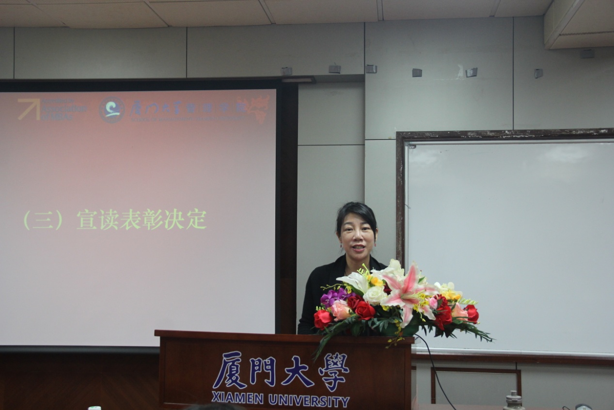 洪秋霞老师在大会上宣读了表彰决定,孙佳、江娇、吴荣梅、吴光锡、邵亢邑、刘晓宇为获得2016年度“管理学院优秀青年志愿者”的同学颁发奖状。