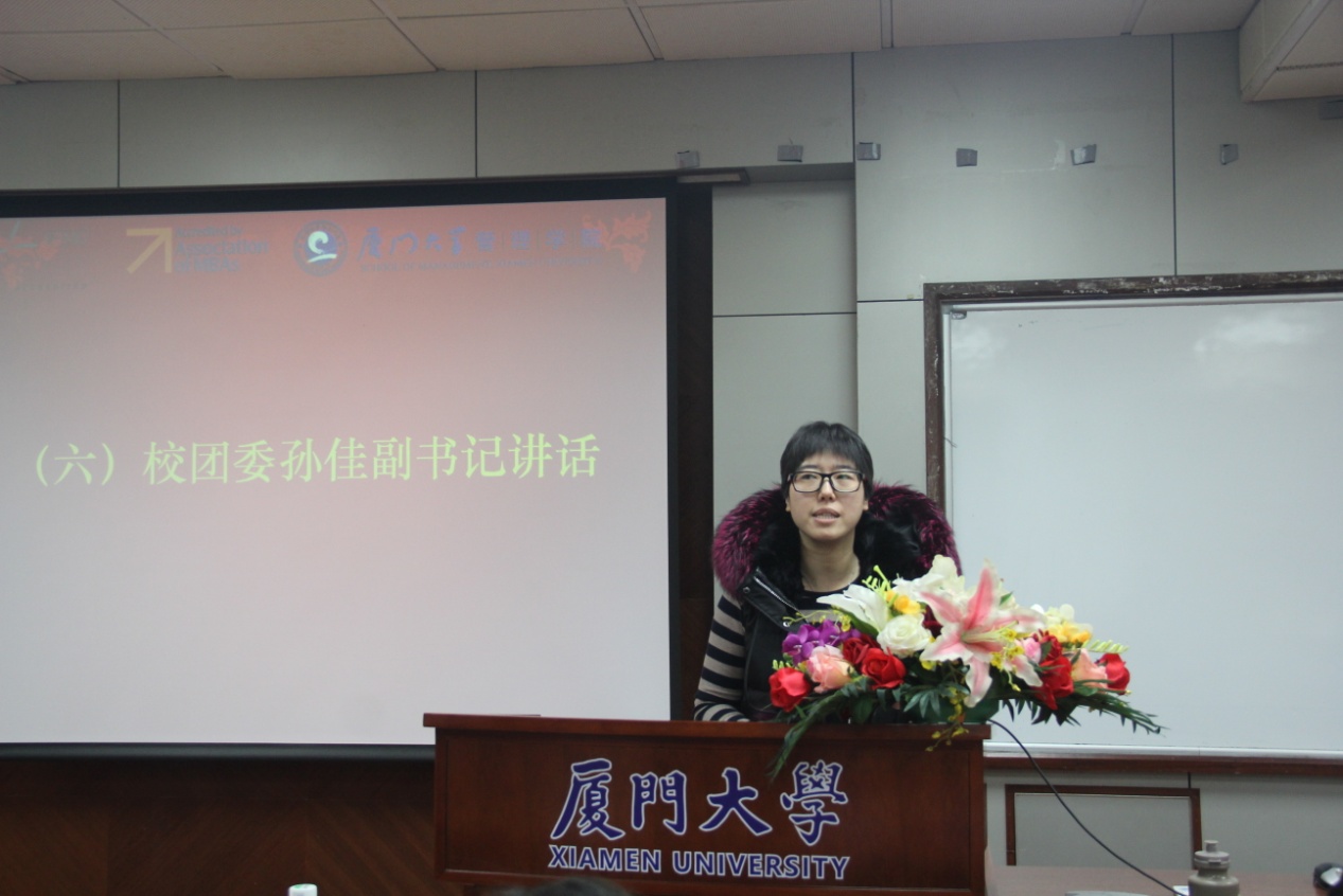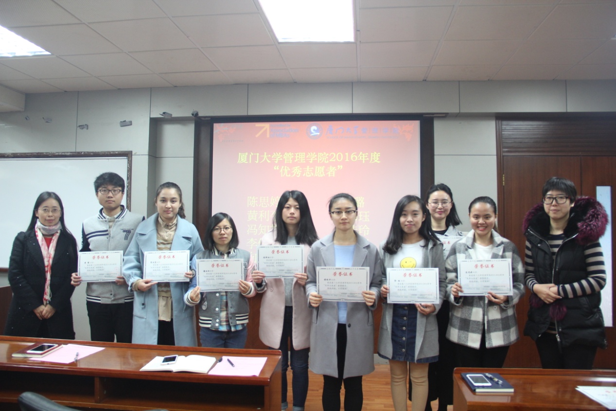 3月16日中午,厦门大学管理学院2016年度“优秀青年志愿者”表彰大会暨厦门大学“毕马威杯”管理案例分析全国十强邀请赛志愿者总结大会于嘉庚二201室顺利召开。校团委副书记孙佳,管理学院党委副书记李峰、洪秋霞,团委书记江娇,团委副书记吴荣梅、吴光锡,辅导员揭上锋、邵亢邑、刘晓宇出席表彰大会。大会由管理学院团委副书记周颖主持。
