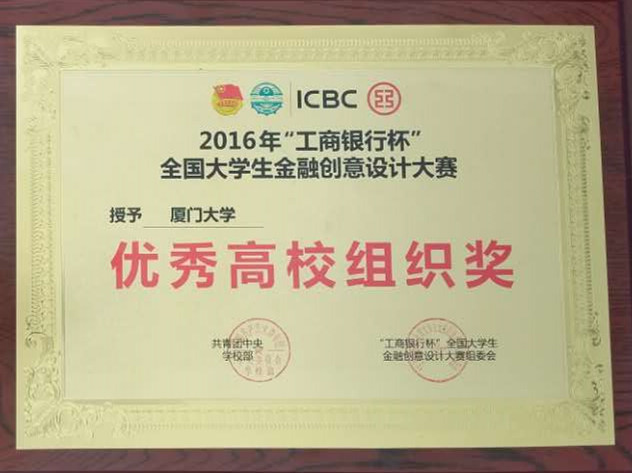 厦门大学学生科技创业与就业服务中心、经济学院学生科创中心承办了本届大赛的厦门大学初赛,在校团委和工行厦门市分行的大力支持下,中心广泛宣传并积极组织学生参赛,共吸引了全校500余名同学参加,推送了46件优秀作品至国赛组委会,厦门大学也凭借出色的组织工作获评高校优秀组织奖。2016年12月13日,在华南赛区复赛中,经济学院与王亚南经济研究院的3支学生团队表现优秀,荣获一等奖1项,二等奖2项,全部获得了进入中国工商银行工作的直通卡。