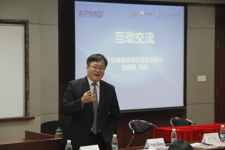 2016年11月9日星期三下午,2017年厦门大学“毕马威杯”管理案例分析全国十强邀请赛启动仪式在成枫楼(嘉庚二)201成功举办,本次活动主持人为管理学院辅导员邵亢邑,出席嘉宾有:毕马威福建地区首席合伙人张增辉先生,毕马威厦门所人力资源主任吴丹璐女士,校学生工作处副处长王洁松,校研究生院综合办副主任罗春霞以及学院党委陈雪玲书记,副院长徐迪,党委副书记李峰、洪秋霞等。