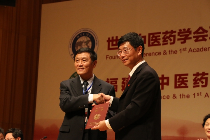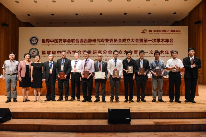 大会主席台领导为世界中联舌象研究专业委员会会长、学术顾问、秘书长、副会长以及福建省中医药学会舌象研究分会会长颁发证书。