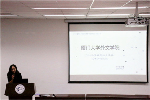 随后,各实践队成员代表依次上台进行实践成果展示。 “译桥”团队关心鹭岛翻译问题,为推动厦门走向世界做出贡献;“媒开言笑”团队考察校园媒体,积极建言献策;“英言厦语”团队运用专业英语知识,助力大山教育;“囊萤之光”团队奔赴竹坝支教帮扶,十年如一日;“杭行世界”团队热心走访调研,助力G20峰会; “Need for stars”团队心系教育,关心关爱农民工子女;“永福镇台湾创业园” 团队践行“大众创业、万众创新”号召,调研探访休闲农业发展模式; “心系传统,文扬两岸”团队奔赴宝岛台湾,对两岸民俗传统进行深度探访……实践过程中拍摄的一张张图片、实践过后制作的一张张幻灯片、记录实践点滴的一段段精美视频——每支队伍短短五分钟的展示饱含着同学们对本次暑期社会实践活动的深刻总结与感悟。